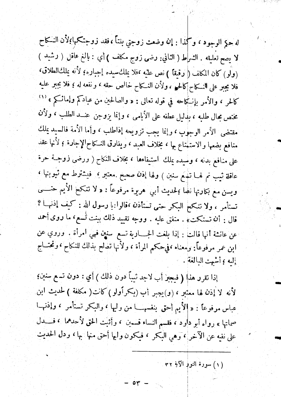 الشَّرْطُ (الثَّانِي: رِضَى زَوْجٍ مُكَلَّفٍ) أَيْ: بَالِغٍ عَاقِلٍ (رَشِيدٍ) (وَلَوْ) كَانَ الْمُكَلَّفُ (رَقِيقًا) نَصَّ عَلَيْهِ، فَلَا يَمْلِكُ سَيِّدُهُ إجْبَارَهُ؛ لِأَنَّهُ يَمْلِكُ الطَّلَاقَ، فَلَا يُجْبَرُ عَلَى النِّكَاحِ كَالْحُرِّ، وَلِأَنَّ النِّكَاحَ خَالِصُ حَقِّهِ، وَنَفْعُهُ لَهُ؛ فَلَا يُجْبَرُ عَلَيْهِ كَالْحُرِّ، وَالْأَمْرُ بِإِنْكَاحِهِ فِي قَوْله تَعَالَى: {وَالصَّالِحِينَ مِنْ عِبَادِكُمْ وَإِمَائِكُمْ} [النور: 32] مُخْتَصٌّ بِحَالِ طَلَبِهِ، بِدَلِيلِ عَطْفِهِ عَلَى الْأَيَامَى، وَإِنَّمَا يُزَوَّجْنَ عِنْدَ الطَّلَبِ، وَلِأَنَّ مُقْتَضَى الْأَمْرِ الْوُجُوبُ، وَإِنَّمَا يَجِبُ تَزْوِيجُهُ إذَا طَلَبَ، وَأَمَّا الْأَمَةُ فَالسَّيِّدُ يَمْلِكُ مَنَافِعَ بُضْعِهَا وَالِاسْتِمْتَاعَ بِهَا، بِخِلَافِ الْعَبْدِ، وَيُفَارِقُ النِّكَاحُ الْإِجَارَةَ؛ لِأَنَّهَا عَقْدٌ عَلَى مَنَافِعِ بَدَنِهِ، وَسَيِّدُهُ يَمْلِكُ اسْتِيفَاءَهَا، بِخِلَافِ النِّكَاحِ (وَرِضَى زَوْجَةٍ حُرَّةٍ عَاقِلَةٍ ثَيِّبٍ تَمَّ لَهَا تِسْعُ سِنِينَ) وَلَهَا إذْنٌ صَحِيحٌ مُعْتَبَرٌ، فَيُشْتَرَطُ مَعَ ثُيُوبَتِهَا، وَيُسَنُّ مَعَ بَكَارَتِهَا نَصًّا؛ لِحَدِيثِ أَبِي هُرَيْرَةَ مَرْفُوعًا: «لَا تُنْكَحُ الْأَيِّمُ حَتَّى تُسْتَأْمَرَ، وَلَا تُنْكَحُ الْبِكْرُ حَتَّى تُسْتَأْذَنَ، قَالُوا: يَا رَسُولَ اللَّهِ: كَيْفَ إذْنُهَا؟ قَالَ: أَنْ تَسْكُتَ» . مُتَّفَقٌ عَلَيْهِ. وَوَجْهُ تَقْيِيدِ ذَلِكَ بِبِنْتِ تِسْعٍ، مَا رَوَى أَحْمَدُ عَنْ عَائِشَةَ أَنَّهَا قَالَتْ: إذَا بَلَغَتْ الْجَارِيَةُ تِسْعَ سِنِينَ فَهِيَ امْرَأَةٌ. وَرُوِيَ عَنْ ابْنِ عُمَرَ مَرْفُوعًا: وَمَعْنَاهُ، فِي حُكْمِ الْمَرْأَةِ، وَلِأَنَّهَا تَصْلُحُ بِذَلِكَ لِلنِّكَاحِ، وَتَحْتَاجُ إلَيْهِ؛ أَشْبَهَتْ الْبَالِغَةَ. إذَا تَقَرَّرَ هَذَا (فَيُجْبِرُ أَبٌ لَا جَدٌّ ثَيِّبًا دُونَ ذَلِكَ) أَيْ: دُونَ تِسْعِ سِنِينَ؛ لِأَنَّهُ لَا إذْنَ لَهَا مُعْتَبَرٌ، (وَ) يُجْبِرُ أَبٌ (بِكْرًا أَوْ لَوْ) كَانَتْ (مُكَلَّفَةً) لِحَدِيثِ ابْنِ عَبَّاسٍ مَرْفُوعًا: «الْأَيِّمُ أَحَقُّ بِنَفْسِهَا مِنْ وَلِيِّهَا، وَالْبِكْرُ تُسْتَأْمَرُ، وَإِذْنُهَا صُمَاتُهَا» رَوَاهُ أَبُو دَاوُد، فَقَسَّمَ النِّسَاءَ قِسْمَيْنِ، وَأَثْبَتَ الْحَقَّ لِأَحَدِهِمَا، فَدَلَّ عَلَى نَفْيِهِ عَنْ الْآخَرِ، وَهِيَ الْبِكْرُ، فَيَكُونُ وَلِيُّهَا أَحَقَّ مِنْهَا بِهَا، وَدَلَّ الْحَدِيثُ