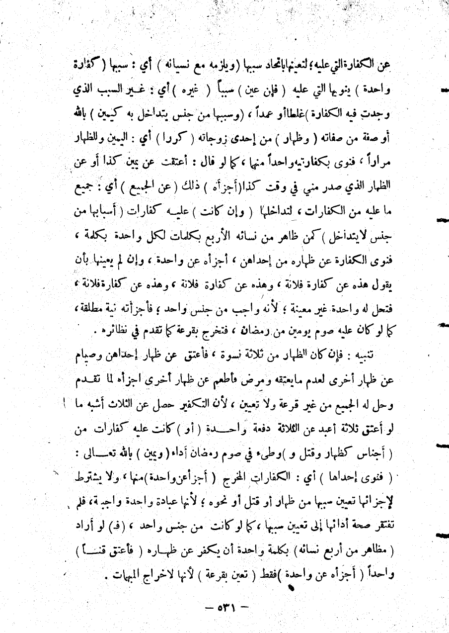 عَنْ الْكَفَّارَةِ الَّتِي عَلَيْهِ؛ لِتَعَيُّنِهَا بِاتِّحَادِ سَبَبِهَا (وَيَلْزَمُهُ مَعَ نِسْيَانِهِ) أَيْ: سَبَبِهَا (كَفَّارَةٌ وَاحِدَةٌ) يَنْوِيهَا الَّتِي عَلَيْهِ (فَإِنْ عَيَّنَ) سَبَبًا (غَيْرَهُ) أَيْ: غَيْرَ السَّبَبِ الَّذِي وُجِدْت فِيهِ الْكَفَّارَةُ غَلَطًا أَوْ عَمْدًا، (وَسَبَبُهَا مِنْ جِنْسٍ يَتَدَاخَلُ بِهِ كَيَمِينٍ) بِاَللَّهِ أَوْ صِفَةٍ مِنْ صِفَاتِهِ (وَظِهَارٍ) مِنْ إحْدَى زَوْجَاتِهِ (كُرِّرَا) أَيْ: الْيَمِينُ وَالظِّهَارُ مِرَارًا، فَنَوَى بِكَفَّارَتَيْهِ وَاحِدًا مِنْهُمَا، كَمَا لَوْ قَالَ: أَعْتَقْت عَنْ يَمِينِ كَذَا أَوْ عَنْ الظِّهَارِ الَّذِي صَدَرَ مِنِّي فِي وَقْتِ كَذَا (أَجْزَأَهُ) ذَلِكَ (عَنْ الْجَمِيعِ) أَيْ: جَمِيعِ مَا عَلَيْهِ مِنْ الْكَفَّارَاتِ، لِتَدَاخُلِهَا (وَإِنْ كَانَتْ) عَلَيْهِ كَفَّارَاتٌ (أَسْبَابُهَا مِنْ جِنْسٍ لَا يَتَدَاخَلُ) كَمَنْ ظَاهَرَ مِنْ نِسَائِهِ الْأَرْبَعِ بِكَلِمَاتٍ لِكُلِّ وَاحِدَةٍ بِكَلِمَةٍ، فَنَوَى الْكَفَّارَةَ عَنْ ظِهَارِهِ مِنْ إحْدَاهُنَّ، أَجْزَأَهُ عَنْ وَاحِدَةٍ، وَإِنْ لَمْ يُعَيِّنْهَا بِأَنْ يَقُولَ: هَذِهِ عَنْ كَفَّارَةِ فُلَانَةَ، وَهَذِهِ عَنْ كَفَّارَةِ فُلَانَةَ، وَهَذِهِ عَنْ كَفَّارَةِ فُلَانَةَ، فَتَحِلُّ لَهُ وَاحِدَةٌ غَيْرُ مُعَيَّنَةٍ؛ لِأَنَّهُ وَاجِبٌ مِنْ جِنْسٍ وَاحِدٍ؛ فَأَجْزَأَتْهُ نِيَّةٌ مُطْلَقَةٌ، كَمَا لَوْ كَانَ عَلَيْهِ صَوْمُ يَوْمَيْنِ مِنْ رَمَضَانَ، فَتَخْرُجُ بِقُرْعَةٍ كَمَا تَقَدَّمَ فِي نَظَائِرِهِ.