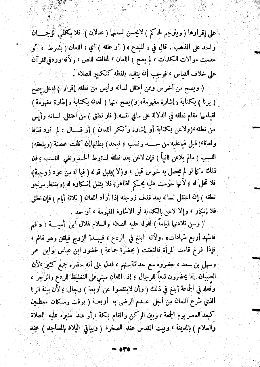 (وَسُنَّ تَلَاعُنُهُمَا قِيَامًا) «لِقَوْلِهِ - عَلَيْهِ الصَّلَاةُ وَالسَّلَامُ - لِهِلَالِ بْنِ أُمَيَّةَ: قُمْ فَاشْهَدْ أَرْبَعَ شَهَادَاتٍ» وَلِأَنَّهُ أَبْلَغُ فِي الرَّدْعِ، فَيَبْدَأُ الزَّوْجُ فَيُلَقَّنُ وَهُوَ قَائِمٌ، فَإِذَا فَرَغَ قَامَتْ الْمَرْأَةُ فَالْتَعَنَتْ (بِحَضْرَةِ جَمَاعَةٍ) لِحُضُورِ ابْنِ عَبَّاسٍ وَابْنِ عُمَرَ وَسَهْلِ بْنِ سَعْدٍ، حَضَرُوهُ مَعَ حَدَاثَةِ سِنِّهِمْ، فَدَلَّ عَلَى أَنَّهُ حَضَرَهُ جَمْعٌ كَثِيرٌ، لِأَنَّ الصِّبْيَانَ إنَّمَا يَحْضُرُونَ تَبَعًا لِلرِّجَالِ؛ إذْ اللِّعَانُ مَبْنِيٌّ عَلَى التَّغْلِيظِ لِلرَّدْعِ وَالزَّجْرِ وَفِعْلُهُ فِي الْجَمَاعَةِ أَبْلَغُ فِي ذَلِكَ (وَأَنْ لَا يَنْقُصُوا عَنْ أَرْبَعَةِ) رِجَالٍ؛ لِأَنَّ بَيِّنَةَ الزِّنَا الَّذِي شُرِعَ اللِّعَانُ مِنْ أَجْلِ عَدَمِ الرِّضَى بِهِ أَرْبَعَةٌ (بِوَقْتٍ وَمَكَانٍ مُعَظَّمَيْنِ كَبَعْدِ الْعَصْرِ يَوْمَ الْجُمُعَةِ، وَبَيْنَ الرُّكْنِ وَالْمَقَامِ بِمَكَّةَ، أَوْ عِنْدَ مِنْبَرِهِ - عَلَيْهِ الصَّلَاةُ وَالسَّلَامُ -) بِالْمَدِينَةِ، وَبَيْتِ الْمَقْدِسِ عِنْدَ الصَّخْرَةِ (وَبِبَاقِي الْبِلَادِ بِالْمَسَاجِدِ) عِنْدَ