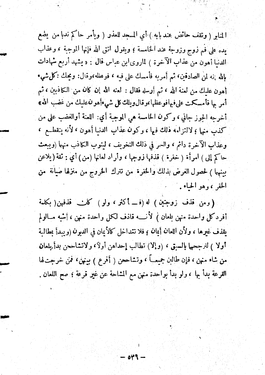 الْمَنَابِرِ (وَتَقِفُ حَائِضٌ عِنْدَ بَابِهِ) أَيْ الْمَسْجِدِ لِلْعُذْرِ (وَيَأْمُرُ حَاكِمٌ نَدْبًا مَنْ يَضَعُ يَدَهُ عَلَى فَمِ زَوْجٍ وَزَوْجَةٍ عِنْدَ الْخَامِسَةِ وَيَقُولُ: اتَّقِ اللَّهَ فَإِنَّهَا الْمُوجِبَةُ، وَعَذَابُ الدُّنْيَا أَهْوَنُ مِنْ عَذَابِ الْآخِرَةِ) لِمَا رَوَى ابْنُ عَبَّاسٍ قَالَ: " يَشْهَدُ أَرْبَعَ شَهَادَاتٍ بِاَللَّهِ إنَّهُ لَمِنْ الصَّادِقِينَ، ثُمَّ أَمَرَ بِهِ فَأَمْسَكَ عَلَى فِيهِ، فَوَعَظَهُ، وَقَالَ: وَيْحَك: كُلُّ شَيْءٍ أَهْوَنُ عَلَيْك مِنْ لَعْنَةِ اللَّهِ، ثُمَّ أَرْسَلَهُ فَقَالَ: لَعَنَهُ اللَّهُ إنْ كَانَ مِنْ الْكَاذِبِينَ، ثُمَّ أَمَرَ بِهَا فَأَمْسَكَتْ عَلَى فِيهَا فَوَعَظَهَا، وَقَالَ: وَيْلُك كُلُّ شَيْءٍ أَهْوَنُ عَلَيْك مِنْ غَضَبِ اللَّهِ " أَخْرَجَهُ الْجُوزَجَانِيُّ، وَكَوْنُ الْخَامِسَةِ هِيَ الْمُوجِبَةُ أَيْ: اللَّعْنَةَ أَوْ الْغَضَبَ عَلَى مَنْ كَذَبَ مِنْهُمَا؛ لِالْتِزَامِهِ ذَلِكَ فِيهَا، وَكَوْنُ عَذَابِ الدُّنْيَا أَهْوَنَ، لِأَنَّهُ يَنْقَطِعُ، وَعَذَابُ الْآخِرَةِ دَائِمٌ، وَالسِّرُّ فِي ذَلِكَ التَّخْوِيفُ، لِيَتُوبَ الْكَاذِبُ مِنْهُمَا.