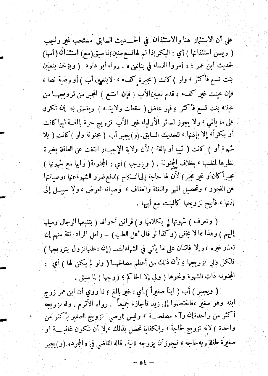 (وَيُسَنُّ اسْتِئْذَانُهَا) أَيْ: الْبِكْرِ إذَا تَمَّ لَهَا تِسْعُ سِنِينَ؛ لِمَا سَبَقَ (مَعَ) اسْتِئْذَانِ (أُمِّهَا) لِحَدِيثِ ابْنِ عُمَرَ: «آمِرُوا النِّسَاءَ فِي بَنَاتِهِنَّ» . رَوَاهُ أَبُو دَاوُد (وَيُؤْخَذُ بِتَعْيِينِ بِنْتِ تِسْعٍ فَأَكْثَرَ، وَلَوْ) كَانَتْ (مُجْبَرَةً كُفْئًا، لَا بِتَعْيِينِ أَبٍ) أَوْ وَصِيِّهِ نَصًّا، فَإِنْ عَيَّنَتْ غَيْرَ كُفْءٍ، قُدِّمَ تَعْيِينُ الْأَبِ (فَإِنْ امْتَنَعَ) الْمُجْبِرُ مِنْ تَزْوِيجِهَا مَنْ عَيَّنَتْهُ بِنْتُ تِسْعٍ فَأَكْثَرَ؛ فَهُوَ عَاضِلٌ (سَقَطَتْ وِلَايَتُهُ) وَيَفْسُقُ بِهِ إنْ تَكَرَّرَ عَلَى مَا يَأْتِي، وَلَا يَجُوزُ لِسَائِرِ الْأَوْلِيَاءِ غَيْرِ الْأَبِ تَزْوِيجُ حُرَّةٍ بَالِغَةٍ ثَيِّبًا كَانَتْ أَوْ بِكْرًا، إلَّا بِإِذْنِهَا، لِلْحَدِيثِ السَّابِقِ.