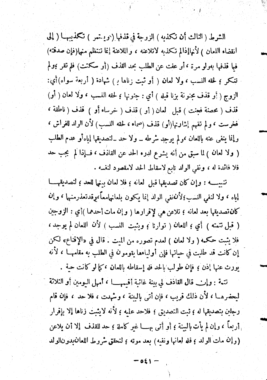 الشَّرْطُ (الثَّالِثُ أَنْ تُكَذِّبَهُ) الزَّوْجَةُ فِي قَذْفِهَا (وَيَسْتَمِرُّ) تَكْذِيبُهَا (إلَى انْقِضَاءِ اللِّعَانِ) لِأَنَّهَا إذَا لَمْ تُكَذِّبْهُ لَا تُلَاعِنْهُ، وَالْمُلَاعَنَةُ إنَّمَا تَنْتَظِمُ مِنْهُمَا (فَإِنْ صَدَّقَتْهُ) فِيمَا قَذَفَهَا بِهِ وَلَوْ مَرَّةً، أَوْ عَفَتْ عَنْ الطَّلَبِ بِحَدِّ الْقَذْفِ (أَوْ سَكَتَتْ) فَلَمْ تُقِرَّ؛ وَلَمْ تُنْكِرْ؛ لَحِقَهُ النَّسَبُ، وَلَا لِعَانَ (أَوْ ثَبَتَ زِنَاهَا بِ) شَهَادَةِ (أَرْبَعَةٍ سِوَاهُ) أَيْ: الزَّوْجِ (أَوْ قَذَفَ مَجْنُونَةً بِزِنًا قَبْلَهُ) أَيْ: جُنُونِهَا؛ لَحِقَهُ النَّسَبُ، وَلَا لِعَانَ (أَوْ) قَذَفَ (مُحْصَنَةً فَجُنَّتْ) قَبْلَ لِعَانٍ (أَوْ) قَذَفَ (خَرْسَاءَ أَوْ) قَذَفَ (نَاطِقَةً، فَخَرِسَتْ) ، وَلَمْ تُفْهِمْ إشَارَتُهَا (أَوْ) قَذَفَ (صَمَّاءَ، لَحِقَهُ النَّسَبُ) لِأَنَّ الْوَلَدَ لِلْفِرَاشِ، وَإِنَّمَا يُنْفَى عَنْهُ بِاللِّعَانِ، وَلَمْ يُوجَدْ شَرْطُهُ - وَلَا حَدَّ - لِتَصْدِيقِهَا إيَّاهُ أَوْ عَدَمِ الطَّلَبِ (وَلَا لِعَانَ) لِمَا سَبَقَ مِنْ أَنَّهُ يُشْرَعُ لِدَرْءِ الْحَدِّ عَنْ الْقَاذِفِ، فَإِذَا لَمْ يَجِبْ حَدٌّ فَلَا فَائِدَةَ لَهُ، وَنَفْيُ الْوَلَدِ تَابِعٌ لِإِسْقَاطِ الْحَدِّ لَا مَقْصُودٌ لِنَفْسِهِ