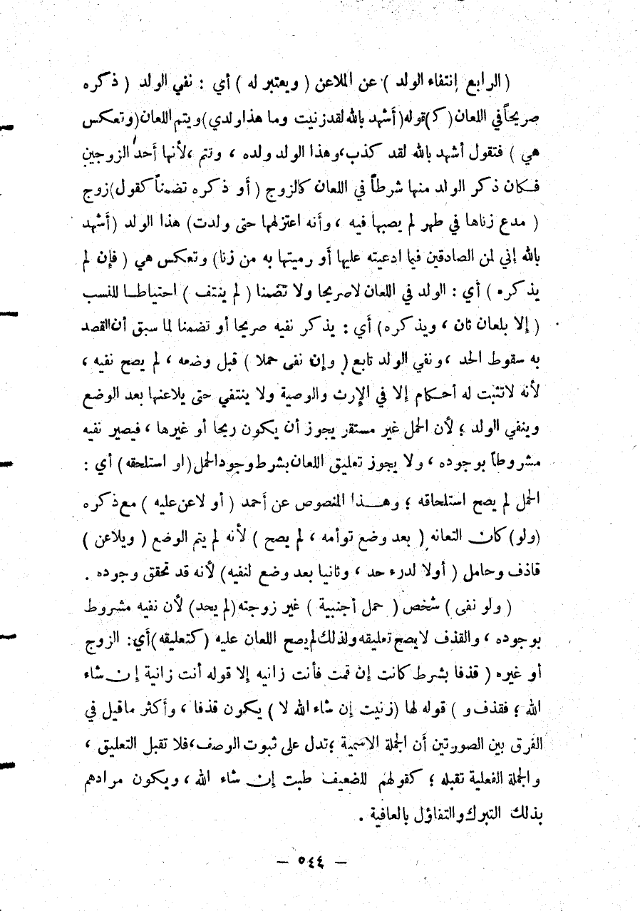 (الرَّابِعُ انْتِفَاءُ الْوَلَدِ) عَنْ الْمُلَاعِنِ (وَيُعْتَبَرُ لَهُ) أَيْ: نَفْيُ الْوَلَدِ (ذَكَرَهُ) صَرِيحًا فِي اللِّعَانِ (كَ) قَوْلِهِ (أَشْهَدُ بِاَللَّهِ لَقَدْ زَنَيْتُ وَمَا هَذَا وَلَدِي) وَيُتِمُّ اللِّعَانَ (وَتَعْكِسُ هِيَ) فَتَقُولُ: أَشْهَدُ بِاَللَّهِ لَقَدْ كَذَبَ، وَهُوَ الْوَلَدُ وَلَدُهُ وَتُتِمُّ لِأَنَّهَا أَحَدُ الزَّوْجَيْنِ فَكَانَ ذِكْرُ الْوَلَدِ مِنْهَا شَرْطًا فِي اللِّعَانِ كَالزَّوْجِ (أَوْ ذِكْرُهُ تَضَمُّنًا كَقَوْلِ) زَوْجٍ (مُدَّعٍ زِنَاهَا فِي طُهْرٍ لَمْ يُصِبْهَا فِيهِ، وَأَنَّهُ اعْتَزَلَهُمَا حَتَّى وَلَدَتْ) هَذَا الْوَلَدَ (أَشْهَدُ بِاَللَّهِ أَنِّي لَمِنْ الصَّادِقِينَ فِيمَا ادَّعَيْتُهُ عَلَيْهَا أَوْ رَمَيْتُهَا بِهِ مِنْ زِنًا) وَتَعْكِسُ هِيَ (فَإِنْ لَمْ يَذْكُرْهُ) أَيْ: الْوَلَدَ فِي اللِّعَانِ لَا صَرِيحًا وَلَا تَضَمُّنًا (لَمْ يَنْتِفْ) احْتِيَاطًا لِلنَّسَبِ (إلَّا بِلِعَانٍ ثَانٍ، وَيَذْكُرُهُ) أَيْ: يَذْكُرُ نَفْيَهُ صَرِيحًا أَوْ تَضَمُّنًا لِمَا سَبَقَ أَنَّ الْقَصْدَ بِهِ سُقُوطُ الْحَدِّ، وَنَفْيُ الْوَلَدِ تَابِعٌ.
