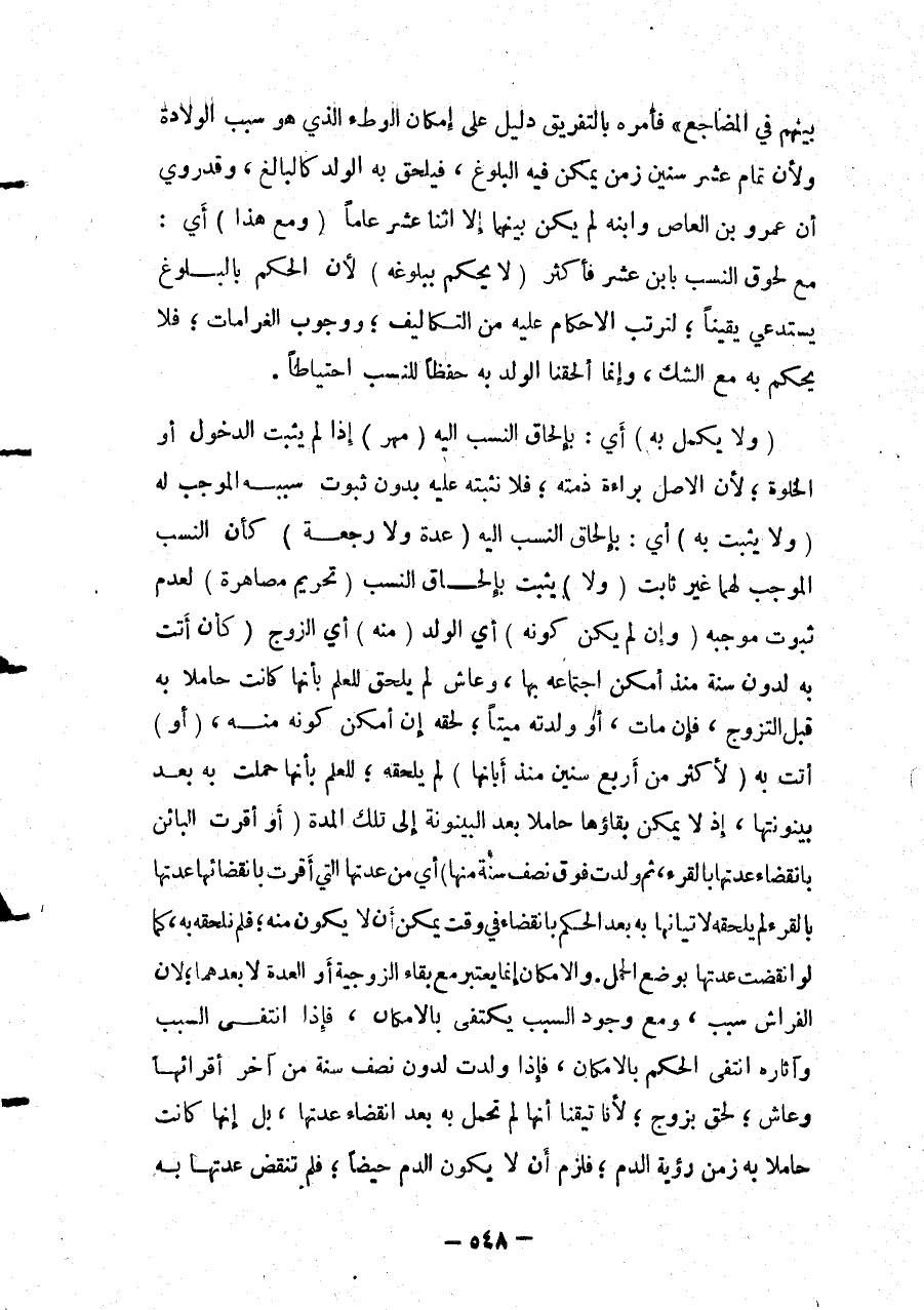بَيْنَهُمْ فِي الْمَضَاجِعِ» فَأَمْرُهُ بِالتَّفْرِيقِ دَلِيلٌ عَلَى إمْكَانِ الْوَطْءِ الَّذِي هُوَ سَبَبُ الْوِلَادَةِ وَلِأَنَّ تَمَامَ عَشْرِ سِنِينَ زَمَنٌ يُمْكِنُ فِيهِ الْبُلُوغُ، فَيُلْحَقُ بِهِ الْوَلَدُ كَالْبَالِغِ، وَقَدْ رُوِيَ أَنَّ عَمْرَو بْنَ الْعَاصِ وَابْنَهُ لَمْ يَكُنْ بَيْنَهُمَا إلَّا اثْنَا عَشَرَ عَامًا (وَمَعَ هَذَا) أَيْ: مَعَ لُحُوقِ النَّسَبِ بِابْنِ عَشْرٍ فَأَكْثَرَ (لَا يُحْكَمُ بِبُلُوغِهِ) لِأَنَّ الْحُكْمَ بِالْبُلُوغِ يَسْتَدْعِي يَقِينًا؛ لِتَرَتُّبِ الْأَحْكَامِ عَلَيْهِ مِنْ التَّكَالِيفِ؛ وَوُجُوبِ الْغَرَامَاتِ؛ فَلَا يُحْكَمُ بِهِ مَعَ الشَّكِّ، وَإِنَّمَا أَلْحَقْنَا الْوَلَدَ بِهِ حِفْظًا لِلنَّسَبِ احْتِيَاطًا. (وَلَا يَكْمُلُ بِهِ) أَيْ: بِإِلْحَاقِ النَّسَبِ إلَيْهِ (مَهْرٌ) إذَا لَمْ يَثْبُتْ الدُّخُولُ أَوْ الْخَلْوَةُ لِأَنَّ الْأَصْلَ بَرَاءَةُ ذِمَّتِهِ؛ فَلَا نُثْبِتُهُ عَلَيْهِ بِدُونِ ثُبُوتِ سَبَبِهِ الْمُوجِبِ لَهُ (وَلَا يَثْبُتُ بِهِ) أَيْ: بِإِلْحَاقِ النَّسَبِ إلَيْهِ (عِدَّةٌ وَلَا رَجْعَةٌ) كَأَنَّ النَّسَبَ الْمُوجِبَ لَهُمَا غَيْرُ ثَابِتٍ (وَلَا) يَثْبُتُ بِإِلْحَاقِ النَّسَبِ (تَحْرِيمُ مُصَاهَرَةٍ) لِعَدَمِ ثُبُوتِ مُوجِبِهِ (وَإِنْ لَمْ يَكُنْ كَوْنُهُ) أَيْ الْوَلَدِ (مِنْهُ) أَيْ الزَّوْجِ (كَأَنْ أَتَتْ بِهِ) لِدُونِ سَنَةٍ مُنْذُ أَمْكَنَ اجْتِمَاعُهُ بِهَا، وَعَاشَ لَمْ يَلْحَقْ لِلْعِلْمِ بِأَنَّهَا كَانَتْ حَامِلًا بِهِ قَبْلَ التَّزَوُّجِ، فَإِنْ مَاتَ، أَوْ وَلَدَتْهُ مَيِّتًا؛ لَحِقَهُ إنْ أَمْكَنَ كَوْنُهُ مِنْهُ، (أَوْ) أَتَتْ بِهِ (لِأَكْثَرَ مِنْ أَرْبَعِ سِنِينَ مُنْذُ أَبَانَهَا) لَمْ يَلْحَقْهُ؛ لِلْعِلْمِ بِأَنَّهَا حَمَلَتْ بِهِ بَعْدَ بَيْنُونَتِهَا، إذْ لَا يُمْكِنُ بَقَاؤُهَا حَامِلًا بَعْدَ الْبَيْنُونَةِ إلَى تِلْكَ الْمُدَّةِ.
