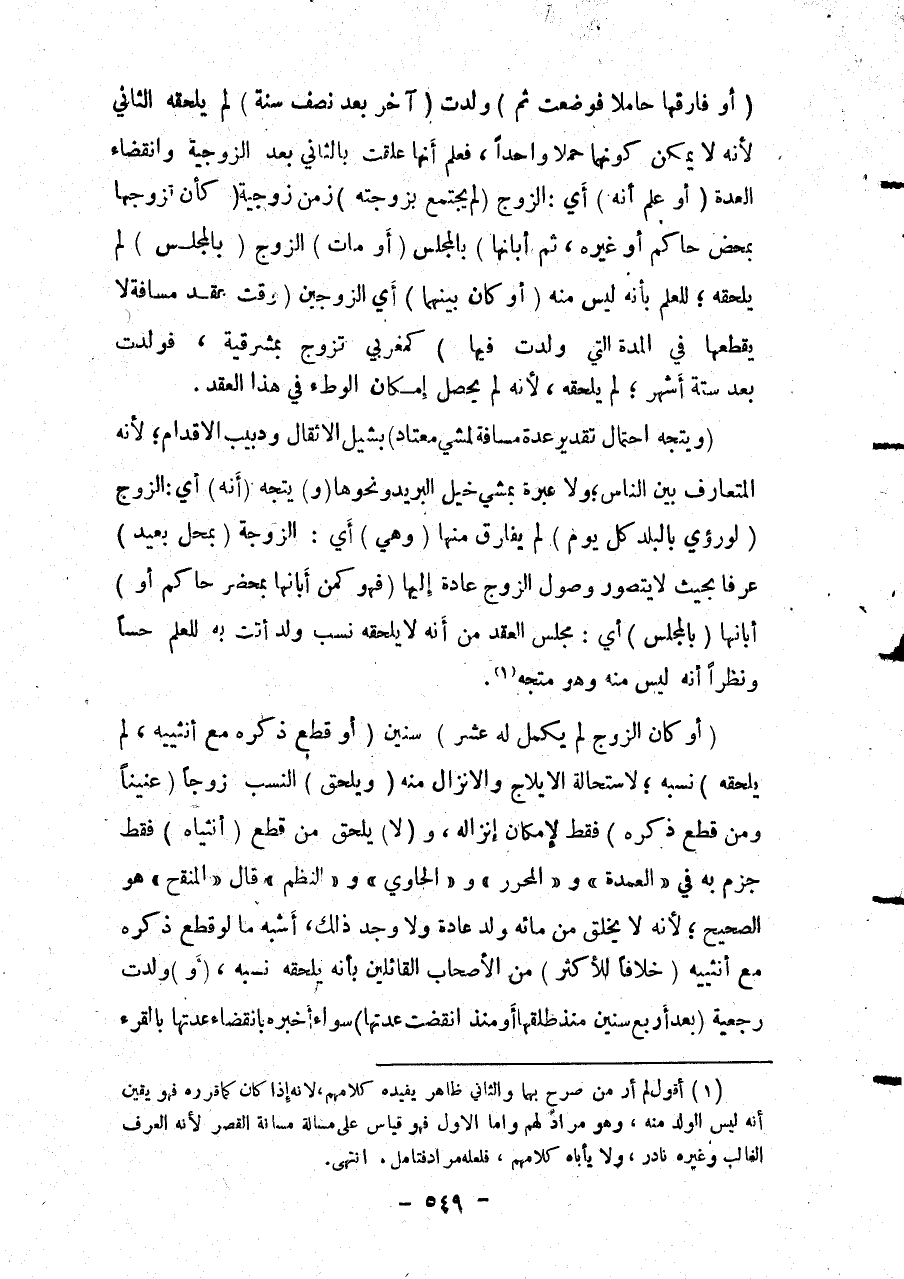 (وَيَتَّجِهُ احْتِمَالُ تَقْدِيرِ عِدَّةِ مَسَافَةٍ لِمَشْيٍ مُعْتَادٍ) بِشَيْلِ الْأَثْقَالِ وَدَبِيبِ الْأَقْدَامِ؛ لِأَنَّهُ الْمُتَعَارَفُ بَيْنَ النَّاسِ؛ وَلَا عِبْرَةَ بِمَشْيِ خَيْلِ الْبَرِيدِ وَنَحْوِهَا (وَ) يَتَّجِهُ (أَنَّهُ) أَيْ: الزَّوْجَ (لَوْ رُئِيَ بِالْبَلَدِ كُلَّ يَوْمٍ) لَمْ يُفَارِقْ مِنْهَا (وَهِيَ) أَيْ: الزَّوْجَةُ (بِمَحَلٍّ بَعِيدٍ) عُرْفًا بِحَيْثُ لَا يُتَصَوَّرُ وُصُولُ الزَّوْجِ عَادَةً إلَيْهَا (فَهُوَ كَمَنْ أَبَانَهَا بِمَحْضَرِ حَاكِمٍ أَوْ) أَبَانَهَا (بِالْمَجْلِسِ) أَيْ: مَجْلِسِ الْعَقْدِ مِنْ أَنَّهُ لَا يَلْحَقُهُ نَسَبُ وَلَدٍ أَتَتْ بِهِ لِلْعِلْمِ حِسًّا وَنَظَرًا أَنَّهُ لَيْسَ مِنْهُ وَهُوَ مُتَّجِهٌ.