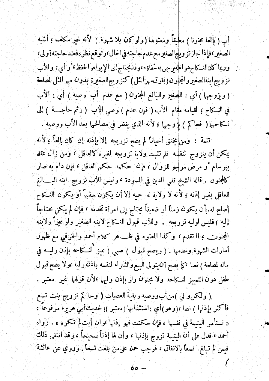 : وَمَنْ يُخْنَقُ أَحْيَانًا لَمْ يَصِحَّ تَزْوِيجُهُ إلَّا بِإِذْنِهِ إنْ كَانَ بَالِغًا؛ لِأَنَّهُ يُمْكِنُ أَنْ يَتَزَوَّجَ لِنَفْسِهِ فَلَمْ تَثْبُتْ وِلَايَةُ تَزْوِيجِهِ لِغَيْرِهِ كَالْعَاقِلِ، وَمَنْ زَالَ عَقْلُهُ بِبِرْسَامٍ أَوْ مَرَضٍ مَرْجُوٍّ لِلزَّوَالِ، فَإِنَّ حُكْمَهُ حُكْمُ الْعَاقِلِ، فَإِنْ دَامَ بِهِ صَارَ كَالْمَجْنُونِ. قَالَهُ الشَّيْخُ تَقِيُّ الدِّينِ فِي الْمُسَوَّدَةِ، وَلَيْسَ لِلْأَبِ تَزْوِيجُ ابْنِهِ الْبَالِغِ الْعَاقِلِ بِغَيْرِ إذْنِهِ؛ لِأَنَّهُ لَا وِلَايَةَ لَهُ عَلَيْهِ إلَّا أَنْ يَكُونَ سَفِيهًا أَوْ يَكُونَ النِّكَاحُ أَصْلَحَ لَهُ بِأَنْ يَكُونَ زَمِنًا أَوْ ضَعِيفًا يَحْتَاجُ إلَى امْرَأَةٍ تَخْدُمُهُ، فَإِنْ لَمْ يَكُنْ مُحْتَاجًا إلَيْهِ؛ فَلَيْسَ لِوَلِيِّهِ تَزْوِيجُهُ. وَلِلْأَبِ قَبُولُ النِّكَاحِ لِابْنِهِ الصَّغِيرِ وَلَوْ مُمَيِّزًا وَلِابْنِهِ الْمَجْنُونِ؛ لِمَا تَقَدَّمَ، وَكَذَا الْمَعْتُوهُ فِي ظَاهِرِ كَلَامِ أَحْمَدَ وَالْخِرَقِيِّ مَعَ ظُهُورِ أَمَارَاتِ الشَّهْوَةِ وَعَدَمِهَا.