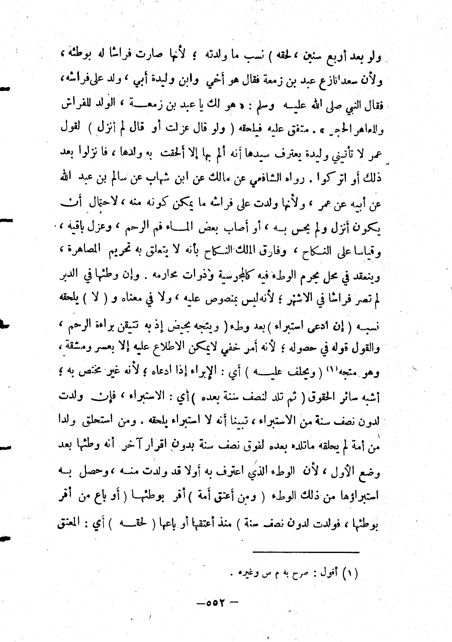 «وَلِأَنَّ سَعْدًا نَازَعَ عَبْدَ بْنَ زَمْعَةَ فَقَالَ: هُوَ أَخِي وَابْنُ وَلِيدَةِ أَبِي، وُلِدَ عَلَى فِرَاشِهِ، فَقَالَ النَّبِيُّ - صَلَّى اللَّهُ عَلَيْهِ وَسَلَّمَ -: هُوَ لَك يَا عَبْدُ بْنَ زَمْعَةَ، الْوَلَدُ لِلْفِرَاشِ وَلِلْعَاهِرِ الْحَجَرُ» مُتَّفَقٌ عَلَيْهِ فَيَلْحَقُهُ (وَلَوْ قَالَ: عَزَلْت أَوْ قَالَ: لَمْ أُنْزِلَ) لِقَوْلِ عُمَرَ لَا تَأْتِينِي وَلِيدَةٌ يَعْتَرِفُ سَيِّدُهَا أَنَّهُ أَلَمَّ بِهَا إلَّا أَلْحَقْت بِهِ وَلَدَهَا، فَانْزِلُوا بَعْدَ ذَلِكَ أَوْ اُتْرُكُوا رَوَاهُ الشَّافِعِيُّ عَنْ مَالِكٍ عَنْ ابْنِ شِهَابٍ عَنْ سَالِمِ بْنِ عَبْدِ اللَّهِ عَنْ أَبِيهِ عَنْ عُمَرَ، وَلِأَنَّهَا وَلَدَتْ عَلَى فِرَاشِهِ مَا يُمْكِنُ كَوْنُهُ مِنْهُ، لِاحْتِمَالِ أَنْ يَكُونَ أَنْزَلَ وَلَمْ يَحُسَّ بِهِ، أَوْ أَصَابَ بَعْضُ الْمَاءِ فَمَ الرَّحِمِ، وَعَزَلَ بَاقِيَهُ، وَقِيَاسًا عَلَى النِّكَاحِ، وَفَارَقَ الْمِلْكُ النِّكَاحَ بِأَنَّهُ لَا يَتَعَلَّقُ بِهِ تَحْرِيمُ الْمُصَاهَرَةِ، وَيَنْعَقِدُ فِي مَحَلٍّ يَحْرُمُ الْوَطْءُ فِيهِ كَالْمَجُوسِيَّةِ وَذَوَاتِ مَحَارِمِهِ وَإِنْ وَطِئَهَا فِي الدُّبُرِ لَمْ تَصِرْ فِرَاشًا فِي الْأَشْهَرِ؛ لِأَنَّهُ لَيْسَ بِمَنْصُوصٍ عَلَيْهِ، وَلَا فِي مَعْنَاهُ وَ (لَا) يَلْحَقُهُ نَسَبُهُ (إنْ ادَّعَى اسْتِبْرَاءً) بَعْدَ وَطْءٍ (وَيَتَّجِهُ بِحَيْضٍ إذْ بِهِ تُتَيَقَّنُ بَرَاءَةُ الرَّحِمِ) ، وَالْقَوْلُ قَوْلُهُ فِي حُصُولِهِ؛ لِأَنَّهُ أَمْرٌ خَفِيٌّ لَا يُمْكِنُ الْإِطْلَاعُ عَلَيْهِ إلَّا بِعُسْرٍ وَمَشَقَّةٍ، وَهُوَ مُتَّجِهٌ.