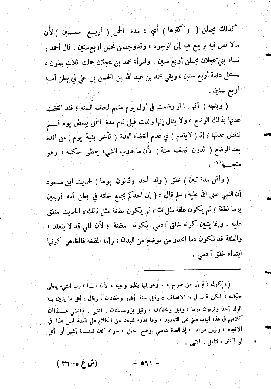 (وَأَقَلُّ مُدَّةٍ تُبَيِّنُ) خَلْقَ (وَلَدٍ أَحَدٌ وَثَمَانُونَ يَوْمًا) لِحَدِيثِ ابْنِ مَسْعُودٍ أَنَّ النَّبِيَّ - صَلَّى اللَّهُ عَلَيْهِ وَسَلَّمَ - قَالَ: «إنَّ أَحَدَكُمْ يُجْمَعُ خَلْقُهُ فِي بَطْنِ أُمِّهِ أَرْبَعِينَ يَوْمًا نُطْفَةً؛ ثُمَّ يَكُونُ عَلَقَةً مِثْلَ ذَلِكَ، ثُمَّ يَكُونُ مُضْغَةً مِثْلَ ذَلِكَ» الْحَدِيثُ مُتَّفَقٌ عَلَيْهِ. وَإِنَّمَا يَتَبَيَّنُ كَوْنُهُ خَلْقَ آدَمِيٍّ بِكَوْنِهِ مُضْغَةً؛ لِأَنَّ الْمَنِيَّ قَدْ لَا يَنْعَقِدُ، وَالْعَلَقَةُ قَدْ تَكُون دَمًا انْحَدَرَ مِنْ مَوْضِعٍ مِنْ الْبَدَنِ، وَأَمَّا الْمُضْغَةُ فَالظَّاهِرُ كَوْنُهَا ابْتِدَاءَ خَلْقِ آدَمِيٍّ.