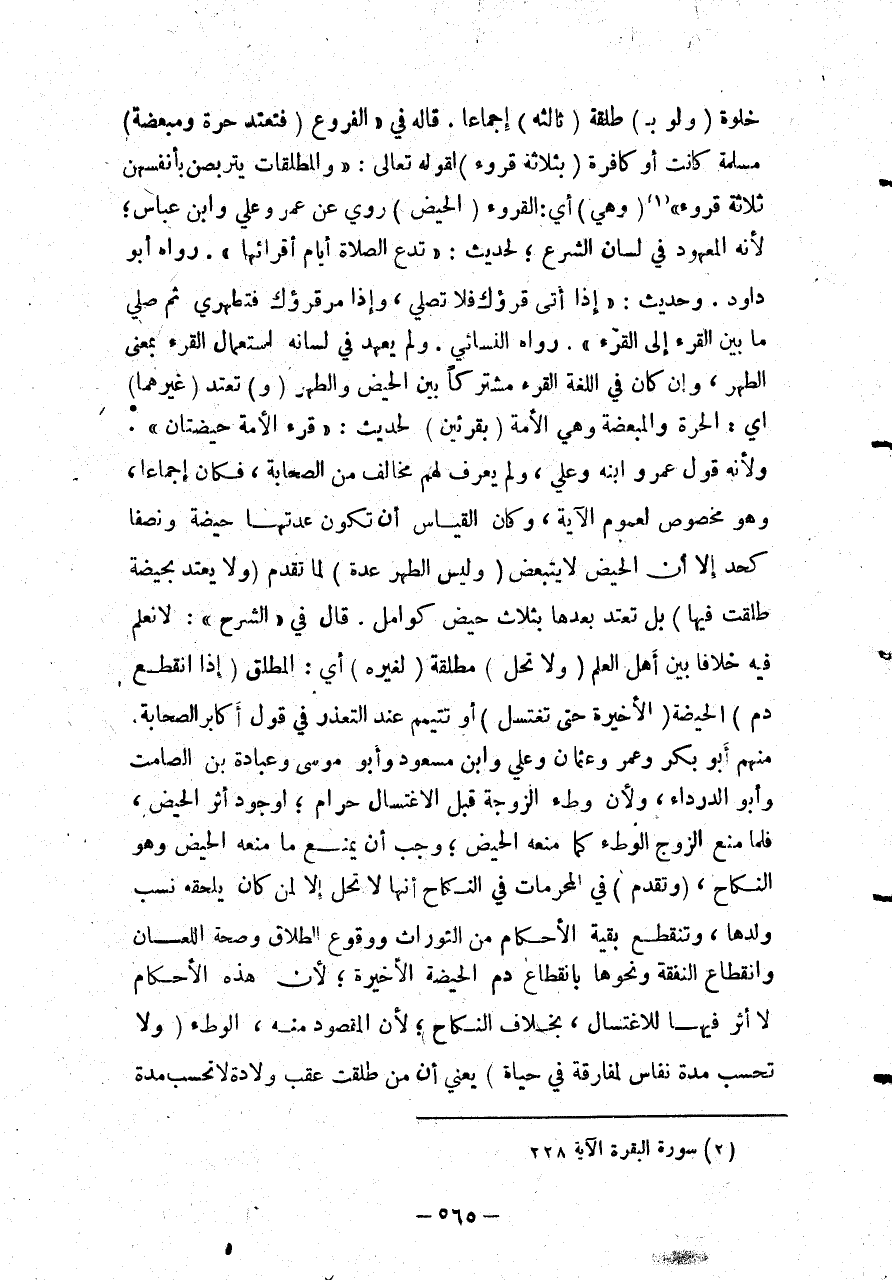 وَحَدِيثِ: «إذَا أَتَى قَرْؤُك فَلَا تُصَلِّي، وَإِذَا مَرَّ قَرْؤُك فَتَطَهَّرِي ثُمَّ صَلِّي مَا بَيْنَ الْقَرْءِ إلَى الْقَرْءِ» رَوَاهُ النَّسَائِيُّ وَلَمْ يُعْهَدْ فِي لِسَانِهِ اسْتِعْمَالُ الْقُرْءِ بِمَعْنَى الطُّهْرِ، وَإِنْ كَانَ فِي اللُّغَةِ الْقُرْءُ مُشْتَرَكًا بَيْن الْحَيْضِ وَالطُّهْرِ (وَ) تَعْتَدُّ (غَيْرُهُمَا) أَيْ: الْحُرَّةِ وَالْمُبَعَّضَةِ وَهِيَ الْأَمَةُ (بِقُرْأَيْنِ) لِحَدِيثِ: «قَرْءُ الْأَمَةِ حَيْضَتَانِ» وَلِأَنَّهُ قَوْلُ عُمَرَ وَابْنِهِ وَعَلِيٍّ، وَلَمْ يُعْرَفْ لَهُمْ مُخَالِفٌ مِنْ الصَّحَابَةِ، فَكَانَ إجْمَاعًا، وَهُوَ مُخَصِّصٌ لِعُمُومِ الْآيَةِ، وَكَانَ الْقِيَاسُ أَنْ تَكُونَ عِدَّتُهَا حَيْضَةً وَنِصْفًا كَحَدٍّ إلَّا أَنَّ الْحَيْضَ لَا يَتَبَعَّضُ (وَلَيْسَ الطُّهْرُ عِدَّةً) لِمَا تَقَدَّمَ.