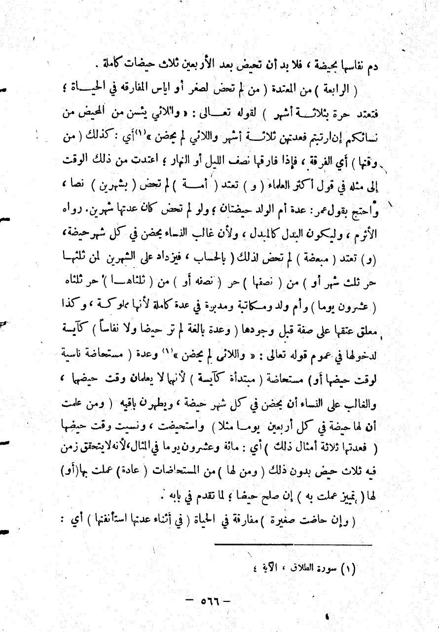 (الرَّابِعَةُ) مِنْ الْمُعْتَدَّةِ (مِنْ لَمْ تَحِضْ لِصِغَرٍ أَوْ إيَاسٍ الْمُفَارَقَةِ فِي الْحَيَاةِ؛ فَتَعْتَدُّ حُرَّةٌ بِثَلَاثَةِ أَشْهُرٍ) لِقَوْلِهِ تَعَالَى: {وَاللائِي يَئِسْنَ مِنَ الْمَحِيضِ مِنْ نِسَائِكُمْ إِنِ ارْتَبْتُمْ فَعِدَّتُهُنَّ ثَلاثَةُ أَشْهُرٍ وَاللائِي لَمْ يَحِضْنَ} [الطلاق: 4] أَيْ: كَذَلِكَ (مِنْ وَقْتِهَا) أَيْ الْفُرْقَةِ، فَإِذَا فَارَقَهَا نِصْفَ اللَّيْلِ أَوْ النَّهَارِ؛ اعْتَدَّتْ مِنْ ذَلِكَ الْوَقْتِ إلَى مِثْلِهِ فِي قَوْلِ أَكْثَرِ الْعُلَمَاءِ.
