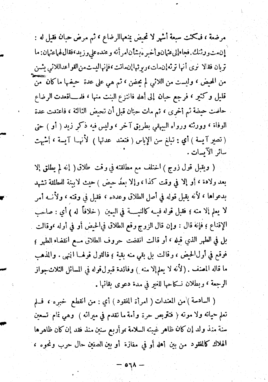 مُرْضِعَةٌ، فَمَكَثَتْ سَبْعَةَ أَشْهُرٍ لَا تَحِيضُ يَمْنَعُهَا الرَّضَاعُ، ثُمَّ مَرِضَ حِبَّانُ فَقِيلَ لَهُ: إنْ مِتَّ وَرِثَتْك فَجَاءَ إلَى عُثْمَانَ وَأَخْبَرَهُ بِشَأْنِ امْرَأَتِهِ وَعِنْدَهُ عَلِيٌّ وَزَيْدٌ، فَقَالَ لَهُمَا عُثْمَانُ: مَا تَرَيَانِ؟ فَقَالَا: نَرَى أَنَّهَا تَرِثُهُ إنْ مَاتَ، وَيَرِثُهَا إنْ مَاتَتْ، فَإِنَّهَا لَيْسَتْ مِنْ الْقَوَاعِدِ اللَّائِي يَئِسْنَ مِنْ الْمَحِيضِ، وَلَيْسَتْ مِنْ اللَّائِي لَمْ يَحِضْنَ، ثُمَّ هِيَ عَلَى عِدَّةِ حَيْضِهَا مَا كَانَ مِنْ قَلِيلٍ وَكَثِيرٍ، فَرَجَعَ حِبَّانُ إلَى أَهْلِهِ فَانْتَزَعَ الْبِنْتَ مِنْهَا، فَلَمَّا قَعَدَتْ الرَّضَاعَ حَاضَتْ حَيْضَةً ثُمَّ أُخْرَى، ثُمَّ مَاتَ حِبَّانُ قَبْلَ أَنْ تَحِيضَ الثَّالِثَةَ؛ فَاعْتَدَّتْ عِدَّةَ الْوَفَاةِ، وَوَرِثَتْهُ وَرَوَاهُ الْبَيْهَقِيُّ بِطَرِيقٍ آخَرَ، وَلَيْسَ فِيهِ ذِكْرُ زَيْدٍ (أَوْ) حَتَّى (تَصِيرُ آيِسَةً) أَيْ: تَبْلُغُ سِنَّ الْإِيَاسِ (فَتَعْتَدُّ عِدَّتَهَا) لِأَنَّهَا آيِسَةٌ، أَشْبَهَتْ سَائِرَ الْآيِسَاتِ.