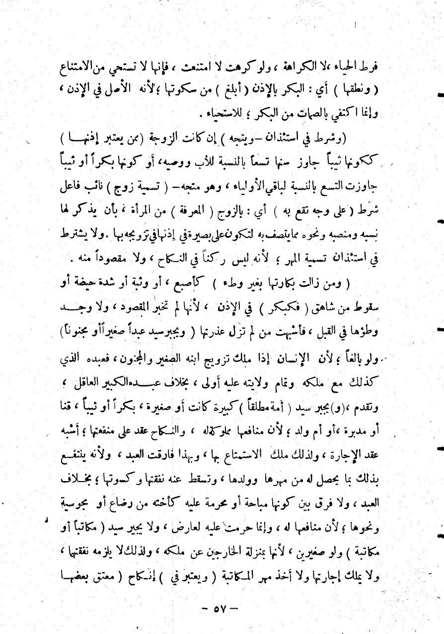 (وَشُرِطَ فِي اسْتِئْذَانٍ - وَيَتَّجِهُ) إنْ كَانَتْ الزَّوْجَةُ (مِمَّنْ يُعْتَبَرُ إذْنُهَا) كَكَوْنِهَا ثَيِّبًا جَاوَزَ سِنُّهَا تِسْعًا بِالنِّسْبَةِ لِلْأَبِ وَوَصِيِّهِ، أَوْ كَوْنُهَا بِكْرًا أَوْ ثَيِّبًا جَاوَزَتْ التِّسْعَ بِالنِّسْبَةِ لِبَاقِي الْأَوْلِيَاءِ، وَهُوَ مُتَّجِهٌ - (تَسْمِيَةُ زَوْجٍ) نَائِبُ فَاعِلِ شُرِطَ (عَلَى وَجْهٍ تَقَعُ بِهِ) أَيْ: بِالزَّوْجِ (الْمَعْرِفَةُ) مِنْ الْمَرْأَةِ، بِأَنْ يَذْكُرَ لَهَا نَسَبَهُ وَمَنْصِبَهُ وَنَحْوَهُ مِمَّا يَتَّصِفُ بِهِ لِتَكُونَ عَلَى بَصِيرَةٍ فِي إذْنِهَا فِي تَزْوِيجِهِ بِهَا. وَلَا يُشْتَرَطُ فِي اسْتِئْذَانٍ تَسْمِيَةُ الْمَهْرِ؛ لِأَنَّهُ لَيْسَ رُكْنًا فِي النِّكَاحِ، وَلَا مَقْصُودًا مِنْهُ.