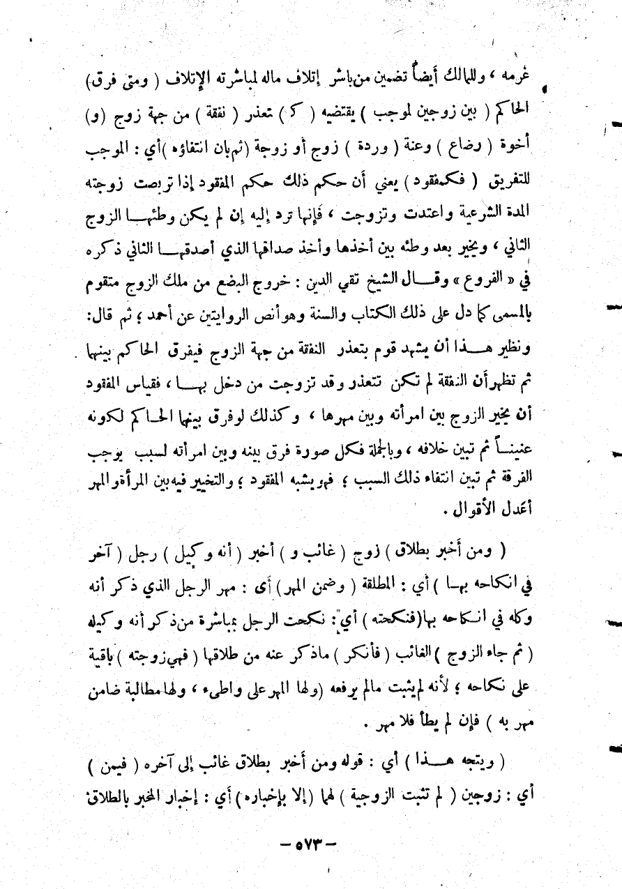 وَقَالَ الشَّيْخُ تَقِيُّ الدِّينِ: خُرُوجُ الْبُضْعِ مِنْ مِلْكِ الزَّوْجِ مُتَقَوِّمٌ بِالْمُسَمَّى كَمَا دَلَّ عَلَى ذَلِكَ الْكِتَابُ وَالسُّنَّةُ وَهُوَ أَنَصُّ الرِّوَايَتَيْنِ عَنْ أَحْمَدَ؛ ثُمَّ قَالَ: وَنَظِيرُ هَذَا أَنْ يَشْهَدَ قَوْمٌ بِتَعَذُّرِ النَّفَقَةِ مِنْ جِهَةِ الزَّوْجِ فَيُفَرِّقُ الْحَاكِمُ بَيْنَهُمَا ثُمَّ تَظْهَرُ أَنَّ النَّفَقَةَ لَمْ تَكُنْ تَتَعَذَّرُ وَقَدْ تَزَوَّجَتْ مَنْ دَخَلَ بِهَا، فَقِيَاسُ الْمَفْقُودِ أَنْ يُخَيَّرَ الزَّوْجُ بَيْنَ امْرَأَتِهِ وَبَيْنَ مَهْرِهَا، وَكَذَلِكَ لَوْ فَرَّقَ بَيْنَهُمَا الْحَاكِمُ لِكَوْنِهِ عِنِّينًا ثُمَّ تَبَيَّنَ خِلَافُهُ، وَبِالْجُمْلَةِ فَكُلُّ صُورَةٍ فَرَّقَ بَيْنَهُ وَبَيْنَ امْرَأَتِهِ لِسَبَبٍ يُوجِبُ الْفُرْقَةَ ثُمَّ تَبَيَّنَ انْتِفَاءُ ذَلِكَ السَّبَبِ؛ فَهُوَ يُشْبِهُ الْمَفْقُودَ؛ وَالتَّخْيِيرُ فِيهِ بَيْنَ الْمَرْأَةِ وَالْمَهْرِ أَعْدَلُ الْأَقْوَالِ.