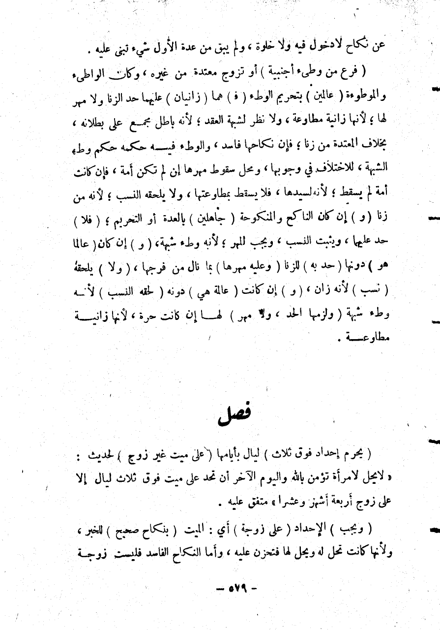 فَصْلٌ: (يَحْرُمُ إحْدَادٌ فَوْقَ ثَلَاثِ) لَيَالٍ بِأَيَّامِهَا (عَلَى مَيِّتٍ غَيْرِ زَوْجٍ) لِحَدِيثِ: «لَا يَحِلُّ لِامْرَأَةٍ تُؤْمِنُ بِاَللَّهِ وَالْيَوْمِ الْآخِرِ أَنْ تُحِدَّ عَلَى مَيِّتٌ فَوْقَ ثَلَاثِ لَيَالٍ إلَّا عَلَى زَوْجٍ أَرْبَعَةَ أَشْهُرٍ وَعَشْرًا» مُتَّفَقٌ عَلَيْهِ.