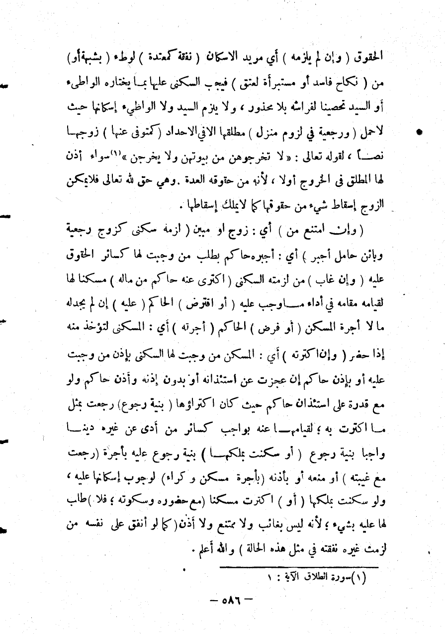 (وَإِنْ امْتَنَعَ مَنْ) أَيْ: زَوْجٌ أَوْ مُبِينٌ (لَزِمَهُ سُكْنَى كَزَوْجِ رَجْعِيَّةٍ وَبَائِنٍ حَامِلٍ أُجْبِرَ) أَيْ: أَجْبَرَهُ حَاكِمٌ بِطَلَبِ مَنْ وَجَبَتْ لَهَا كَسَائِرِ الْحُقُوقِ عَلَيْهِ