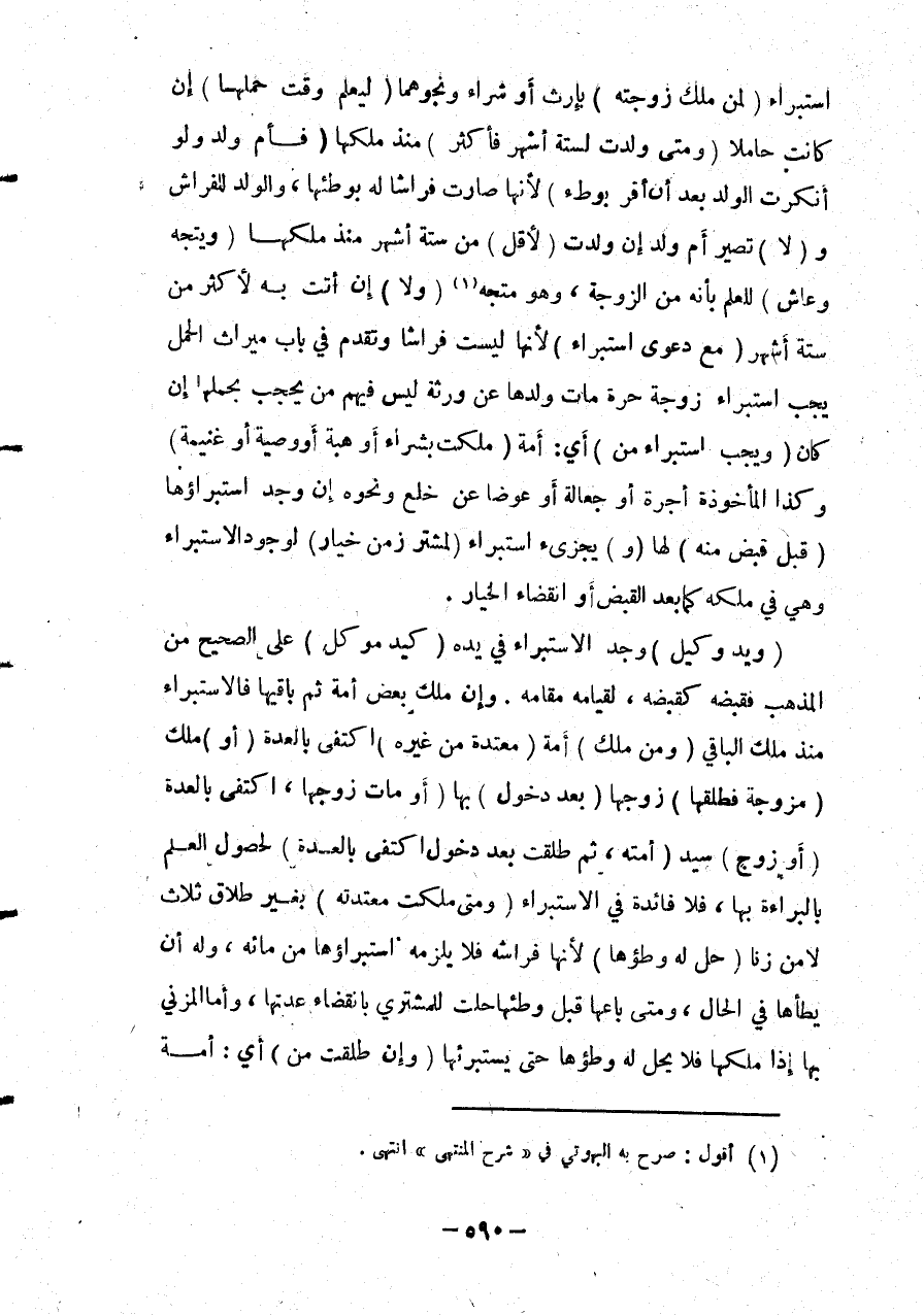 اسْتِبْرَاءٌ (لِمَنْ مَلَكَ زَوْجَتَهُ) بِإِرْثٍ أَوْ شِرَاءٍ وَنَحْوِهِمَا (لِيَعْلَمَ وَقْتَ حَمْلِهَا) إنْ كَانَتْ حَامِلًا (وَمَتَى وَلَدَتْ لِسِتَّةِ أَشْهُرٍ فَأَكْثَرَ) مُنْذُ مَلَكَهَا (فَأُمُّ وَلَدٍ وَلَوْ أَنْكَرَتْ الْوَلَدَ بَعْدَ أَنْ أَقَرَّ بِوَطْءٍ) لِأَنَّهَا صَارَتْ فِرَاشًا لَهُ بِوَطْئِهَا، وَالْوَلَدُ لِلْفِرَاشِ وَ (لَا) تَصِيرُ أُمَّ وَلَدٍ إنْ وَلَدَتْ (لِأَقَلَّ) مِنْ سِتَّةِ أَشْهُرٍ مُنْذُ مَلَكَهَا (وَيَتَّجِهُ وَعَاشَ) لِلْعِلْمِ بِأَنَّهُ مِنْ الزَّوْجَةِ، وَهُوَ مُتَّجِهٌ (وَلَا) إنْ أَتَتْ بِهِ لِأَكْثَرَ مِنْ سِتَّةِ أَشْهُرٍ (مَعَ دَعْوَى اسْتِبْرَاءٍ) لِأَنَّهَا لَيْسَتْ فِرَاشًا وَتَقَدَّمَ فِي بَابِ مِيرَاثِ الْحَمْلِ يَجِبُ اسْتِبْرَاءُ زَوْجَةٍ حُرَّةٍ مَاتَ وَلَدُهَا عَنْ وَرَثَةٍ لَيْسَ فِيهِمْ مَنْ يُحْجَبُ بِحَمْلِهَا إنْ كَانَ.
