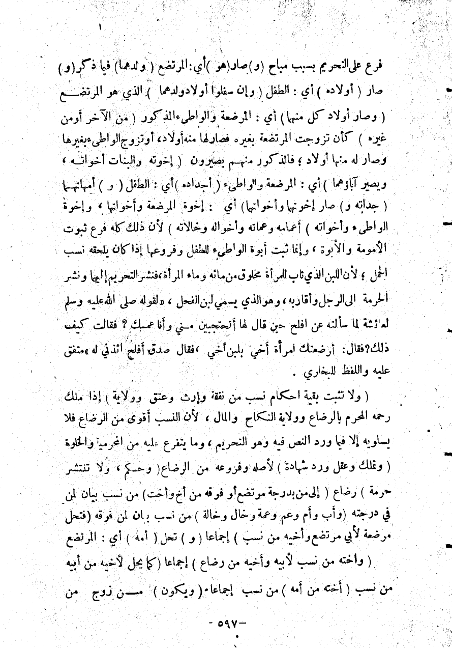(وَ) صَارَ (هُوَ) أَيْ: الْمُرْتَضِعُ (وَلَدَهُمَا) فِيمَا ذُكِرَ (وَ) صَارَ (أَوْلَادُهُ) أَيْ: الطِّفْلِ (وَإِنْ سَفَلُوا أَوْلَادَ وَلَدِهِمَا) الَّذِي هُوَ الْمُرْتَضِعُ (وَصَارَ أَوْلَادُ كُلٍّ مِنْهُمَا) أَيْ: الْمُرْضِعَةِ وَالْوَاطِئِ الْمَذْكُورِ (مِنْ الْآخَرِ أَوْ مِنْ غَيْرِهِ) كَأَنْ تَزَوَّجَتْ الْمُرْتَضِعَةُ بِغَيْرِهِ فَصَارَ لَهَا مِنْهُ أَوْلَادٌ، أَوْ تَزَوَّجَ الْوَاطِئُ بِغَيْرِهَا وَصَارَ لَهُ مِنْهَا أَوْلَادٌ؛ فَالذُّكُورُ مِنْهُمْ يَصِيرُونَ (إخْوَتَهُ وَالْبَنَاتُ أَخَوَاتِهِ، وَيَصِيرُ آبَاؤُهُمَا) أَيْ: الْمُرْضِعَةِ وَالْوَاطِئِ (أَجْدَادَهُ) أَيْ: الطِّفْلِ (وَ) أُمَّهَاتُهُمَا (جَدَّاتِهِ وَ) صَارَ إخْوَتُهُمَا وَ (أَخَوَاتُهُمَا) أَيْ: إخْوَةُ الْمُرْضِعَةِ وَأَخَوَاتُهَا، (وَإِخْوَةُ الْوَاطِئِ وَأَخَوَاتُهُ) أَعْمَامَهُ وَعَمَّاتِهِ وَأَخْوَالَهُ وَخَالَاتِهِ؛ لِأَنَّ ذَلِكَ كُلَّهُ فَرْعُ ثُبُوتِ الْأُمُومَةِ وَالْأُبُوَّةِ، وَإِنَّمَا ثَبَتَ أُبُوَّةُ الْوَاطِئِ لِلطِّفْلِ وَفُرُوعُهَا إذَا كَانَ يَلْحَقُهُ نَسَبُ الْحَمْلِ؛ لِأَنَّ اللَّبَنَ الَّذِي ثَابَ لِلْمَرْأَةِ مَخْلُوقٌ مِنْ مَائِهِ وَمَاءِ الْمَرْأَةِ، فَنَشَرَ التَّحْرِيمَ إلَيْهِمَا وَنَشَرَ الْحُرْمَةَ إلَى الرَّجُلِ وَأَقَارِبِهِ، وَهُوَ الَّذِي يُسَمَّى لَبَنُ الْفَحْلِ، «لِقَوْلِهِ - صَلَّى اللَّهُ عَلَيْهِ وَسَلَّمَ - لِعَائِشَةَ لَمَّا سَأَلَتْهُ عَنْ أَفْلَحَ حِينَ قَالَ لَهَا أَتَحْتَجِبِينَ مِنِّي وَأَنَا عَمُّك؟ فَقَالَتْ كَيْفَ ذَلِكَ؟ فَقَالَ: أَرْضَعَتْك امْرَأَةُ أَخِي بِلَبَنِ أَخِي، فَقَالَ صَدَقَ أَفْلَحُ ائْذَنِي لَهُ» مُتَّفَقٌ عَلَيْهِ وَاللَّفْظُ لِلْبُخَارِيِّ.