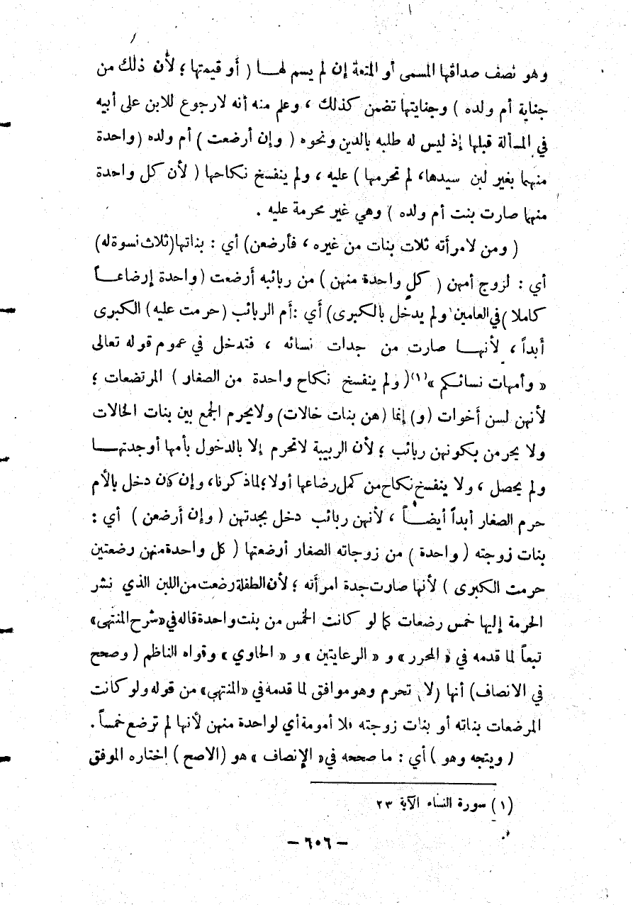 (وَمَنْ لِامْرَأَتِهِ ثَلَاثُ بَنَاتٍ مِنْ غَيْرِهِ، فَأَرْضَعْنَ) أَيْ: بَنَاتُهَا (ثَلَاثَ نِسْوَةٍ لَهُ) أَيْ: لِزَوْجِ أُمِّهِنَّ (كُلُّ وَاحِدَةٍ مِنْهُنَّ) مِنْ رَبَائِبِهِ أَرْضَعَتْ (وَاحِدَةً إرْضَاعًا كَامِلًا) فِي الْعَامَيْنِ، (وَلَمْ يَدْخُلْ بِالْكُبْرَى) أَيْ: أُمِّ الرَّبَائِبِ (حَرُمَتْ عَلَيْهِ) الْكُبْرَى أَبَدًا. لِأَنَّهَا صَارَتْ مِنْ جَدَّاتِ نِسَائِهِ، فَتَدْخُلُ فِي عُمُومِ قَوْله تَعَالَى {وَأُمَّهَاتُ نِسَائِكُمْ} [النساء: 23] .