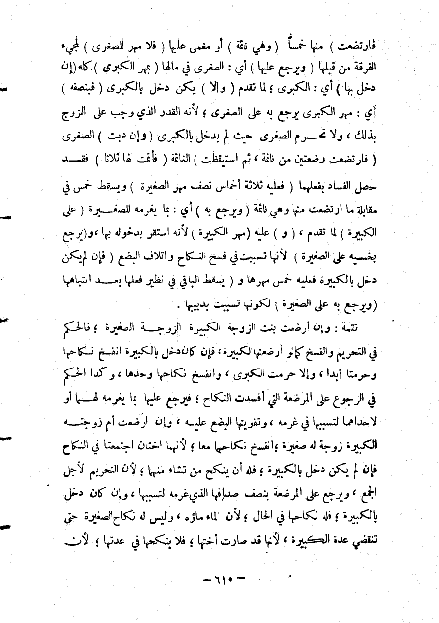 فَارْتَضَعَتْ) مِنْهَا خَمْسًا (وَهِيَ نَائِمَةٌ) أَوْ مُغْمًى عَلَيْهَا (فَلَا مَهْرَ لِلصُّغْرَى) لِمَجِيءِ الْفُرْقَةِ مِنْ قِبَلِهَا (وَيَرْجِعُ عَلَيْهَا) أَيْ: الصُّغْرَى فِي مَالِهَا (بِمَهْرِ الْكُبْرَى) كُلِّهِ (إنْ دَخَلَ بِهَا) أَيْ: الْكُبْرَى؛ لِمَا تَقَدَّمَ (وَإِلَّا) يَكُنْ دَخَلَ بِالْكُبْرَى (فَبِنِصْفِهِ) أَيْ: مَهْرِ الْكُبْرَى يَرْجِعُ بِهِ عَلَى الصُّغْرَى؛ لِأَنَّهُ الْقَدْرُ الَّذِي وَجَبَ عَلَى الزَّوْجِ بِذَلِكَ، وَلَا تَحْرُمُ الصُّغْرَى حَيْثُ لَمْ يَدْخُلْ بِالْكُبْرَى.