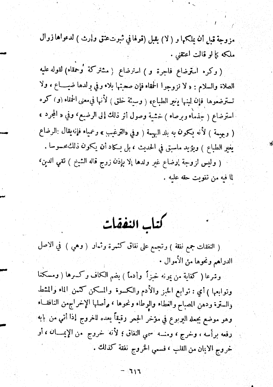 ِ (النَّفَقَاتُ جَمْعُ نَفَقَةٍ) وَتُجْمَعُ عَلَى نِفَاقٍ كَثَمَرَةٍ وَثِمَارٍ (وَهِيَ) فِي الْأَصْلِ الدَّرَاهِمُ وَنَحْوُهَا مِنْ الْأَمْوَالِ. وَشَرْعًا (كِفَايَةُ مَنْ يُمَوِّنُهُ خُبْزًا وَأُدْمًا) بِضَمِّ الْكَافِ وَكَسْرِهَا (وَمَسْكَنًا وَتَوَابِعَهَا) أَيْ: تَوَابِعَ الْخُبْزِ وَالْأُدْمِ وَالْكِسْوَةِ وَالْمَسْكَنِ كَثَمَنِ الْمَاءِ وَالْمُشْطِ وَالسُّتْرَةِ وَدُهْنِ الْمِصْبَاحِ وَالْغِطَاءِ وَالْوِطَاءِ وَنَحْوِهَا، وَأَصْلُهَا الْإِخْرَاجُ مِنْ النَّافِقَاءِ وَهُوَ مَوْضِعٌ يَجْعَلُهُ الْيَرْبُوعُ فِي مُؤَخَّرِ الْجُحْرِ رَقِيقًا يُعِدُّهُ لِلْخُرُوجِ إذَا أَتَى مِنْ بَابِهِ رَفَعَهُ بِرَأْسِهِ، وَخَرَجَ، وَمِنْهُ سُمِّيَ النِّفَاقُ؛ لِأَنَّهُ خُرُوجٌ مِنْ الْإِيمَانِ، أَوْ خُرُوجُ الْإِيمَانِ مِنْ الْقَلْبِ، فَسُمِّيَ الْخُرُوجُ نَفَقَةً كَذَلِكَ.