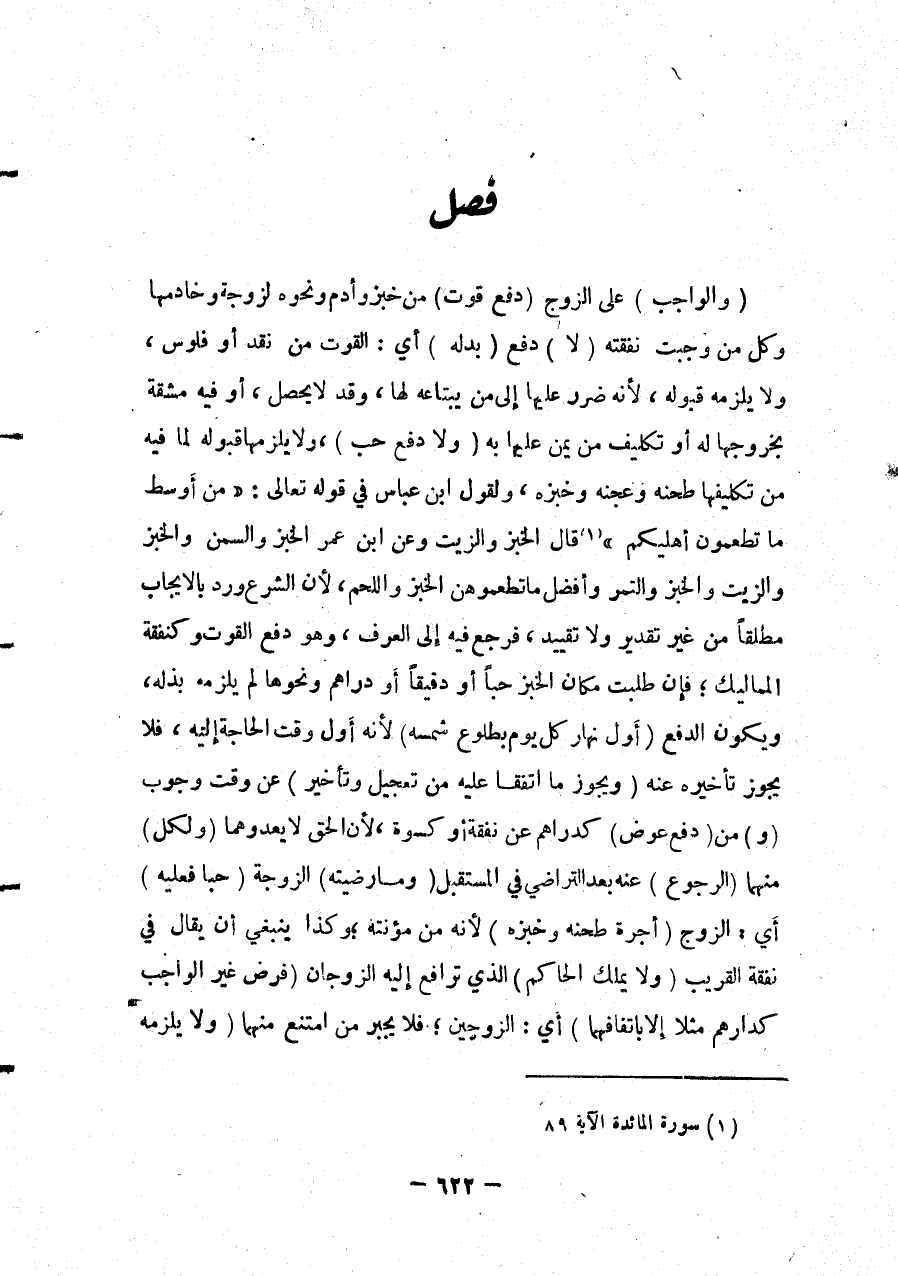 فَصْلٌ (وَالْوَاجِبُ) عَلَى الزَّوْجِ (دَفْعُ قُوتٍ) مِنْ خُبْزٍ وَأُدْمٍ وَنَحْوِهِ لِزَوْجَةٍ وَخَادِمِهَا وَكُلِّ مَنْ وَجَبَتْ نَفَقَتُهُ (لَا) دَفْعُ (بَدَلِهِ) أَيْ: الْقُوتِ مِنْ نَقْدٍ أَوْ فُلُوسٍ، وَلَا يَلْزَمُهُ قَبُولُهُ؛ لِأَنَّهُ ضَرَرٌ عَلَيْهَا إلَى مَنْ يَبْتَاعُهُ لَهَا، وَقَدْ لَا يَحْصُلُ، أَوْ فِيهِ مَشَقَّةٌ بِخُرُوجِهَا لَهُ أَوْ تَكْلِيفُ مَنْ يَمُنُّ عَلَيْهَا بِهِ (وَلَا دَفْعُ حَبٍّ) ، وَلَا يَلْزَمُهَا قَبُولُهُ لِمَا فِيهِ مِنْ تَكْلِيفِهَا طَحْنَهُ وَعَجْنَهُ وَخَبْزَهُ، وَلِقَوْلِ ابْنِ عَبَّاسٍ فِي قَوْله تَعَالَى: {مِنْ أَوْسَطِ مَا تُطْعِمُونَ أَهْلِيكُمْ} [المائدة: 89] قَالَ: الْخُبْزُ وَالزَّيْتُ.