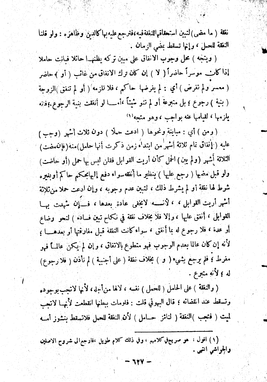 (وَيَتَّجِهُ) مَحَلُّ وُجُوبِ الْإِنْفَاقِ عَلَى مُبِينٍ تَرَكَهُ يَظُنُّهَا حَائِلًا فَبَانَتْ حَامِلًا إذَا كَانَ مُوسِرًا حَاضِرًا (لَا) إنْ كَانَ تَرَكَ الْإِنْفَاقَ مِنْ غَائِبٍ (أَوْ) حَاضِرٍ (مُعْسِرٍ وَلَمْ تُفْرَضْ) أَيْ: لَمْ يَفْرِضْهَا حَاكِمٌ، فَلَا تَلْزَمُهُ (أَوْ لَمْ تُنْفِقْ) الزَّوْجَةُ (بِنِيَّةِ) رُجُوعٍ؛ بَلْ مُتَبَرِّعَةٍ أَوْ لَمْ تَنْوِ شَيْئًا، أَمَّا لَوْ أَنْفَقَتْ بِنِيَّةِ الرُّجُوعِ؛ فَإِنَّهُ يَلْزَمُهَا، لِقِيَامِهَا عَنْهُ بِوَاجِبٍ، وَهُوَ مُتَّجِهٌ.