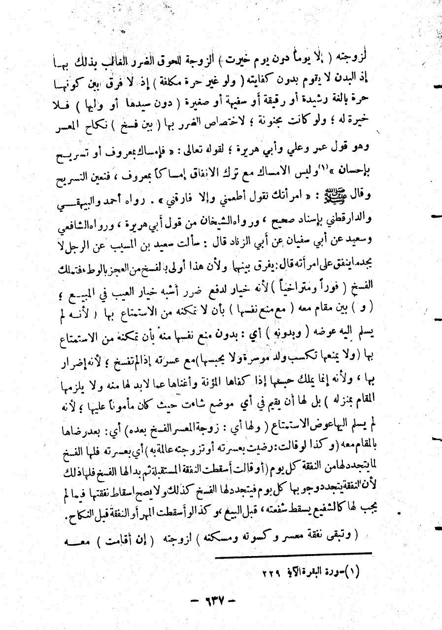 وَرَوَاهُ الشَّافِعِيُّ وَسَعِيدٌ عَنْ أَبِي سُفْيَانَ عَنْ أَبِي الزِّنَادِ قَالَ: سَأَلْت سَعِيدَ بْنَ الْمُسَيِّبِ عَنْ الرَّجُلِ لَا يَجِدُ مَا يُنْفِقُ عَلَى امْرَأَتِهِ قَالَ: يُفَرَّقُ بَيْنَهُمَا وَلِأَنَّ هَذَا أَوْلَى بِالْفَسْخِ مِنْ الْعَجْزِ بِالْوَطْءِ فَتَمْلِكُ الْفَسْخَ (فَوْرًا وَمُتَرَاخِيًا) ؛ لِأَنَّهُ خِيَارٌ لِدَفْعِ ضَرَرٍ أَشْبَهَ خِيَارَ الْعَيْبِ فِي الْمَبِيعِ؛ (وَ) بَيْنَ مُقَامٍ مَعَهُ (مَعَ مَنْعِ نَفْسِهَا) بِأَنْ لَا تُمَكِّنُهُ مِنْ الِاسْتِمْتَاعِ بِهَا؛ لِأَنَّهُ لَمْ يُسَلَّمْ إلَيْهِ عِوَضُهُ (وَبِدُونِهِ) أَيْ: بِدُونِ مَنْعِ نَفْسِهَا مِنْهُ بِأَنْ تُمَكِّنَهُ مِنْ الِاسْتِمْتَاعِ بِهَا (وَلَا يَمْنَعُهَا تَكَسُّبُ وَلَدِ مُوسِرَةٍ وَلَا يَحْبِسُهَا) مَعَ عُسْرَتِهِ إذَا لَمْ تَفْسَخْ؛ لِأَنَّهُ إضْرَارٌ بِهَا، وَلِأَنَّهُ إنَّمَا يَمْلِكُ حَبْسَهَا إذَا كَفَاهَا الْمُؤْنَةَ وَأَغْنَاهَا عَمَّا لَا بُدَّ لَهَا مِنْهُ (وَلَا يَلْزَمُهَا الْمُقَامُ بِمَنْزِلِهِ) بَلْ لَهَا أَنْ تُقِيمَ فِي أَيِّ مَوْضِعٍ شَاءَتْ حَيْثُ كَانَ مَأْمُونًا عَلَيْهَا؛ لِأَنَّهُ لَمْ يُسَلِّمْ إلَيْهَا عِوَضَ الِاسْتِمْتَاعِ (وَلَهَا أَيْ: زَوْجَةِ الْمُعْسِرِ الْفَسْخُ بَعْدَهُ) أَيْ: بَعْدَ رِضَاهَا بِالْمُقَامِ مَعَهُ (وَكَذَا لَوْ قَالَتْ: رَضِيت بِعُسْرَتِهِ أَوْ تَزَوَّجْتُهُ عَالِمَةً بِهِ) أَيْ بِعُسْرَتِهِ فَلَهَا الْفَسْخُ لِمَا يَتَجَدَّدُ لَهَا مِنْ النَّفَقَةِ كُلَّ يَوْمٍ (أَوْ قَالَتْ أَسْقَطْت النَّفَقَةَ الْمُسْتَقْبَلَةَ ثُمَّ بَدَا لَهَا الْفَسْخُ فَلَهَا ذَلِكَ) ؛ لِأَنَّ النَّفَقَةَ يَتَجَدَّدُ وُجُوبُهَا كُلَّ يَوْمٍ فَيَتَجَدَّدُ لَهَا الْفَسْخُ كَذَلِكَ وَلَا يَصِحُّ إسْقَاطُ نَفَقَتِهَا فِيمَا لَمْ يَجِبْ لَهَا كَالشَّفِيعِ يُسْقِطُ شُفْعَتَهُ، قَبْلَ الْبَيْعِ، وَكَذَا لَوْ أَسْقَطَتْ الْمَهْرَ أَوْ النَّفَقَةَ قَبْلَ النِّكَاحِ. (وَتَبْقَى نَفَقَةُ مُعْسِرٍ وَكِسْوَتُهُ وَمَسْكَنُهُ) لِزَوْجَتِهِ (إنْ أَقَامَتْ) مَعَهُ