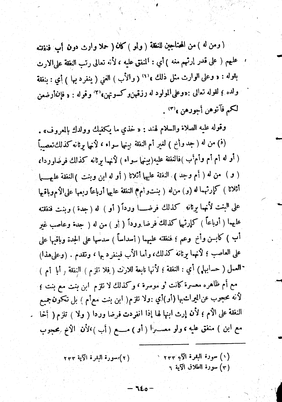 (وَمَنْ لَهُ) مِنْ الْمُحْتَاجِينَ لِلنَّفَقَةِ (وَلَوْ) كَانَ (حَمْلًا وَارِثٌ دُونَ أَبٍ فَنَفَقَتُهُ) عَلَيْهِمْ (عَلَى قَدْرِ إرْثِهِمْ مِنْهُ) أَيْ: الْمُنْفَقِ عَلَيْهِ؛ لِأَنَّهُ تَعَالَى رَتَّبَ النَّفَقَةَ عَلَى الْإِرْثِ بِقَوْلِهِ: {وَعَلَى الْوَارِثِ مِثْلُ ذَلِكَ} [البقرة: 233] (وَالْأَبُ) الْغَنِيُّ (يَنْفَرِدُ بِهَا) أَيْ: بِنَفَقَةِ وَلَدِهِ لِقَوْلِهِ تَعَالَى {وَعَلَى الْمَوْلُودِ لَهُ رِزْقُهُنَّ وَكِسْوَتُهُنَّ} [البقرة: 233] : وَقَوْلُهُ: {فَإِنْ أَرْضَعْنَ لَكُمْ فَآتُوهُنَّ أُجُورَهُنَّ} [الطلاق: 6] ".