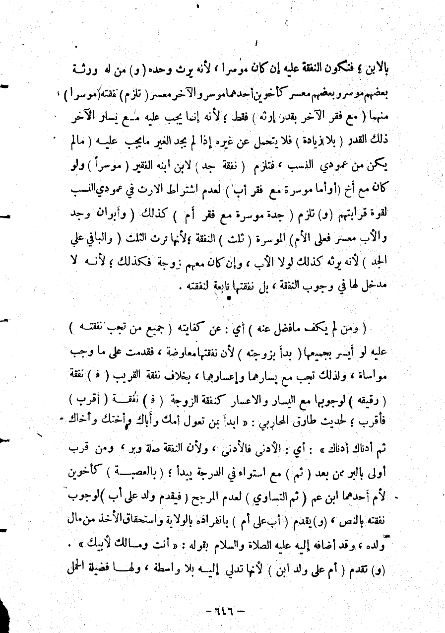 (وَمِنْ لَمْ يَكْفِ مَا فَضَلَ عَنْهُ) أَيْ: عَنْ كِفَايَتِهِ (جَمِيعُ مِنْ تَجِبُ نَفَقَتُهُ) عَلَيْهِ لَوْ أَيْسَرَ بِجَمِيعِهَا (بَدَأَ بِزَوْجَتِهِ) ؛ لِأَنَّ نَفَقَتَهَا مُعَارَضَةٌ، فَقُدِّمَتْ عَلَى مَا وَجَبَ مُوَاسَاةً، وَلِذَلِكَ تَجِبُ مَعَ يَسَارِهِمَا وَإِعْسَارِهِمَا، بِخِلَافِ نَفَقَةِ الْقَرِيبِ (ف) نَفَقَةُ (رَقِيقِهِ) لِوُجُوبِهَا مَعَ الْيَسَارِ وَالْإِعْسَارِ كَنَفَقَةِ الزَّوْجَةِ (ف) نَفَقَةُ (أَقْرَبَ) فَأَقْرَبَ؛ لِحَدِيثِ طَارِقٍ الْمُحَارِبِيِّ: «ابْدَأْ بِمَنْ تَعُولُ أُمَّك وَأَبَاك وَأُخْتَك وَأَخَاك ثُمَّ أَدْنَاك أَدْنَاك» : أَيْ: الْأَدْنَى فَالْأَدْنَى، وَلِأَنَّ النَّفَقَةَ صِلَةٌ وَبِرٌّ، وَمَنْ قَرُبَ أَوْلَى، بِالْبِرِّ مِمَّنْ بَعُدَ (ثُمَّ) مَعَ اسْتِوَاءٍ فِي الدَّرَجَةِ يَبْدَأُ؛ (بِالْعَصَبَةِ) كَأَخَوَيْنِ لِأُمٍّ أَحَدُهُمَا ابْنُ عَمٍّ (ثُمَّ التَّسَاوِي) لِعَدَمِ الْمُرَجِّحِ (فَيُقَدَّمُ وَلَدٌ عَلَى أَبٍ) لِوُجُوبِ نَفَقَتِهِ بِالنَّصِّ، (وَ) يُقَدَّمُ (أَبٌ عَلَى أُمٍّ) بِانْفِرَادِهِ بِالْوِلَايَةِ وَاسْتِحْقَاقِ الْأَخْذِ مِنْ مَالِ وَلَدِهِ، وَقَدْ أَضَافَهُ إلَيْهِ - عَلَيْهِ الصَّلَاةُ وَالسَّلَامُ - بِقَوْلِهِ: «أَنْتَ وَمَالُكَ لِأَبِيكَ» .
