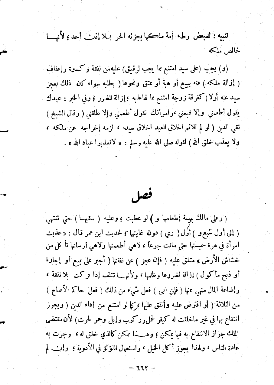 (وَ) يَجِبُ (عَلَى سَيِّدٍ امْتَنَعَ مِمَّا يَجِبُ لِرَقِيقٍ) عَلَيْهِ مِنْ نَفَقَةٍ وَكِسْوَةٍ وَإِعْفَافٍ (إزَالَةُ مِلْكِهِ) عَنْهُ بَيْعٌ أَوْ هِبَةٌ أَوْ عِتْقٌ وَنَحْوُهَا (بِطَلَبِهِ سَوَاءٌ كَانَ ذَلِكَ بِعَجْزِ سَيِّدٍ عَنْهُ أَوْ لَا) كَفِرْقَةِ زَوْجَةٍ امْتَنَعَ مِمَّا لَهَا عَلَيْهِ؛ إزَالَةٌ لِلضَّرَرِ؛ وَفِي الْخَبَرِ: «عَبْدُك يَقُولُ أَطْعِمْنِي وَإِلَّا فَبِعْنِي، وَامْرَأَتُك تَقُولُ أَطْعِمْنِي وَإِلَّا طَلِّقْنِي» (وَقَالَ الشَّيْخُ) تَقِيُّ الدِّينِ (لَوْ لَمْ تُلَائِمْ أَخْلَاقُ الْعَبْدِ أَخْلَاقَ سَيِّدِهِ، لَزِمَهُ إخْرَاجُهُ عَنْ مِلْكِهِ، وَلَا يُعَذِّبُ خَلْقَ اللَّهِ) لِقَوْلِهِ - صَلَّى اللَّهُ عَلَيْهِ وَسَلَّمَ -: «لَا تُعَذِّبُوا عِبَادَ اللَّهِ.»