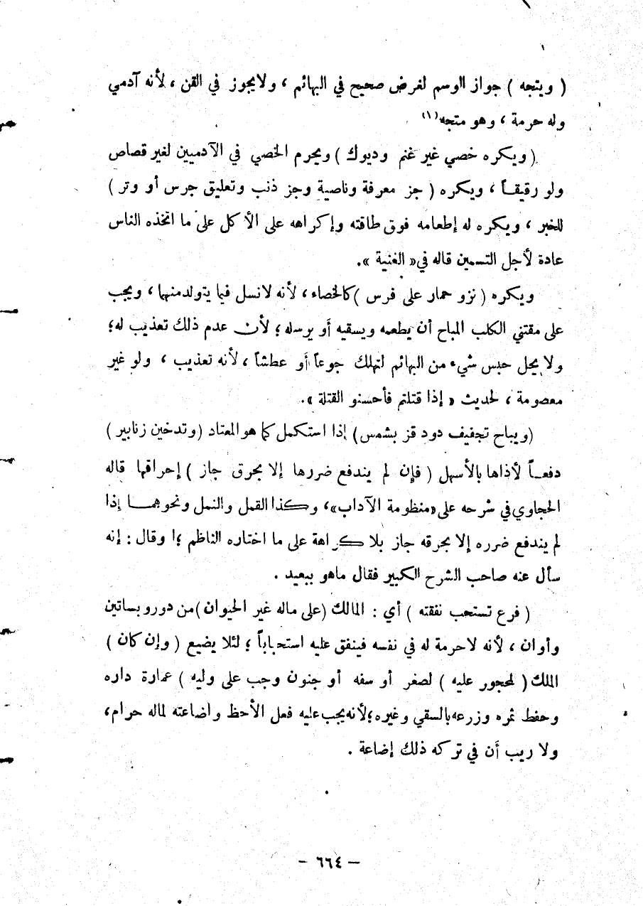 . (وَيُكْرَهُ خَصْيُ غَيْرُ غَنَمٍ وَدُيُوكٍ) وَيَحْرُمُ الْخَصِيُّ فِي الْآدَمِيِّينَ لِغَيْرِ قِصَاصٍ وَلَوْ رَقِيقًا، وَيُكْرَهُ (جَزُّ مَعْرِفَةٍ وَنَاصِيَةٍ وَجَزُّ ذَنَبٍ وَتَعْلِيقُ جَرَسٍ أَوْ وَتَرٍ) لِلْخَبَرِ، وَيُكْرَهُ لَهُ إطْعَامُهُ فَوْقَ طَاقَتِهِ وَإِكْرَاهُهُ عَلَى الْأَكْلِ عَلَى مَا اتَّخَذَهُ النَّاسُ عَادَةً لِأَجْلِ التَّسْمِينِ قَالَهُ فِي " الْقُنْيَةِ ".