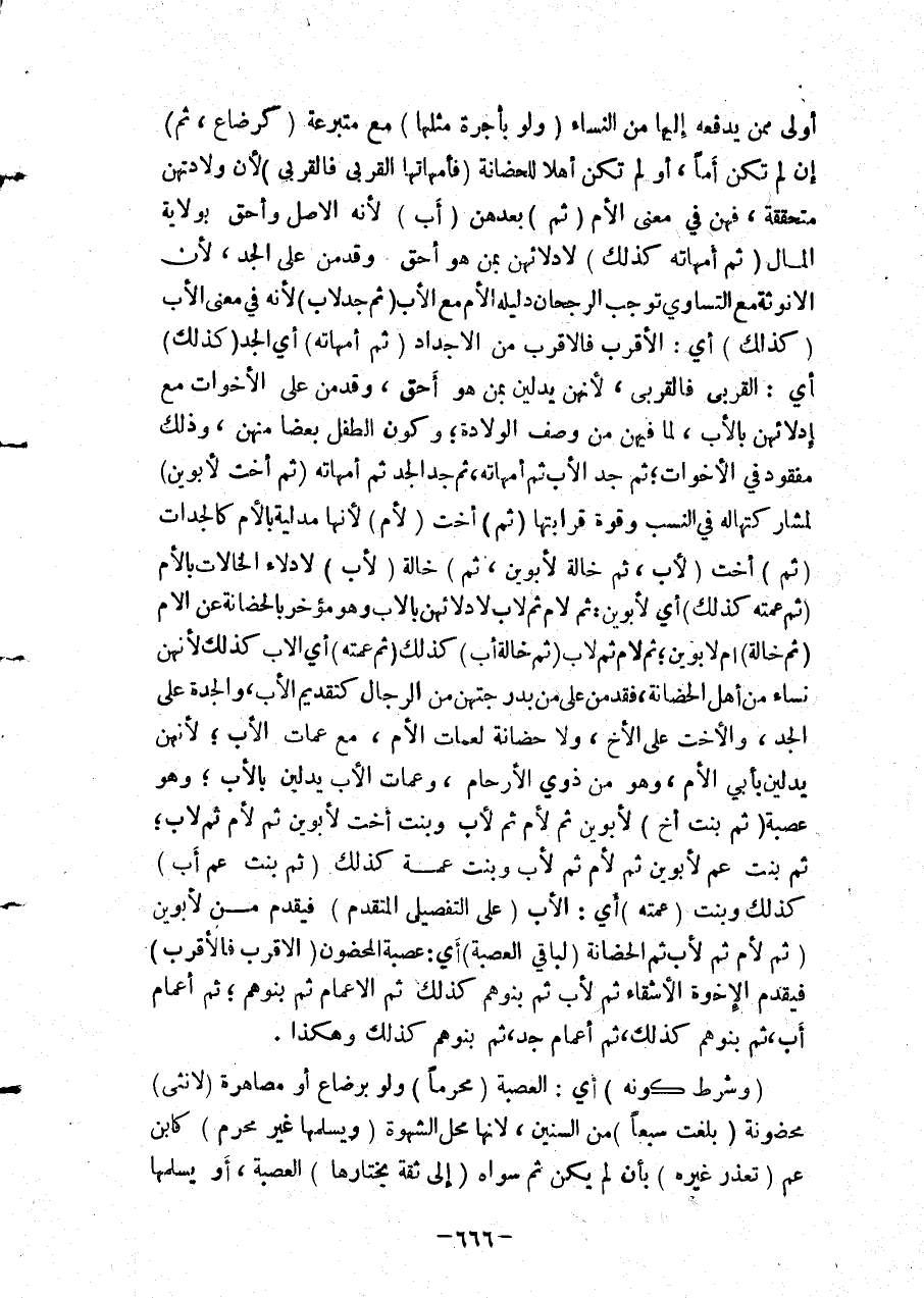وَلَا حَضَانَةَ لِعَمَّاتِ الْأُمِّ، مَعَ عَمَّاتِ الْأَبِ؛ لِأَنَّهُنَّ يُدْلِينَ بِأَبِي الْأُمِّ، وَهُوَ مِنْ ذَوِي الْأَرْحَامِ، وَعَمَّاتُ الْأَبِ يُدْلِينَ بِالْأَبِ؛ وَهُوَ عَصَبَةٌ (ثُمَّ بِنْتُ أَخٍ) لِأَبَوَيْنِ ثُمَّ لِأُمٍّ ثُمَّ لِأَبٍ وَبِنْتُ أُخْتٍ لِأَبَوَيْنِ ثُمَّ لِأُمٍّ ثُمَّ لِأَبٍ؛ ثُمَّ بِنْتُ عَمٍّ لِأَبَوَيْنِ ثُمَّ لِأُمٍّ ثُمَّ لِأَبٍ وَبِنْتُ عَمَّةٍ كَذَلِكَ (ثُمَّ بِنْتُ عَمِّ أَبٍ) كَذَلِكَ وَبِنْتُ (عَمَّتِهِ) أَيْ: الْأَبِ (عَلَى التَّفْصِيلِ الْمُتَقَدِّمِ) فَيُقَدَّمُ مَنْ لِأَبَوَيْنِ (ثُمَّ لِأُمٍّ ثُمَّ لِأَبٍ ثُمَّ الْحَضَانَةُ لِبَاقِي الْعَصَبَةِ) أَيْ: عَصَبَةِ الْمَحْضُونِ (الْأَقْرَبُ فَالْأَقْرَبُ) فَيُقَدَّمُ الْإِخْوَةُ الْأَشِقَّاءُ ثُمَّ لِأَبٍ ثُمَّ بَنُوهُمْ كَذَلِكَ ثُمَّ الْأَعْمَامُ ثُمَّ بَنُوهُمْ؛ ثُمَّ أَعْمَامُ أَبٍ، ثُمَّ بَنُوهُمْ كَذَلِكَ، ثُمَّ أَعْمَامُ جَدٍّ، ثُمَّ بَنُوهُمْ كَذَلِكَ وَهَكَذَا.