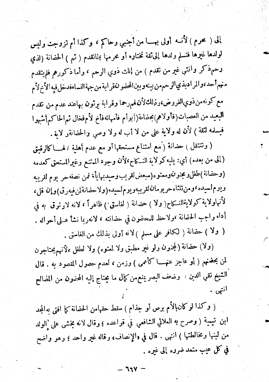 (وَكَذَا لَوْ كَانَ بِالْأُمِّ بَرَصٌ أَوْ جُذَامٌ) سَقَطَ حَقُّهَا مِنْ الْحَضَانَةِ كَمَا أَفْتَى بِهِ الْمَجْدُ بْنُ تَيْمِيَّةَ (وَصَرَّحَ بِهِ الْعَلَائِيُّ الشَّافِعِيُّ فِي قَوَاعِدِهِ؛ وَقَالَ؛ لِأَنَّهُ يُخْشَى عَلَى الْوَالِدِ مِنْ لَبَنِهَا وَمُخَالَطَتِهَا) انْتَهَى.