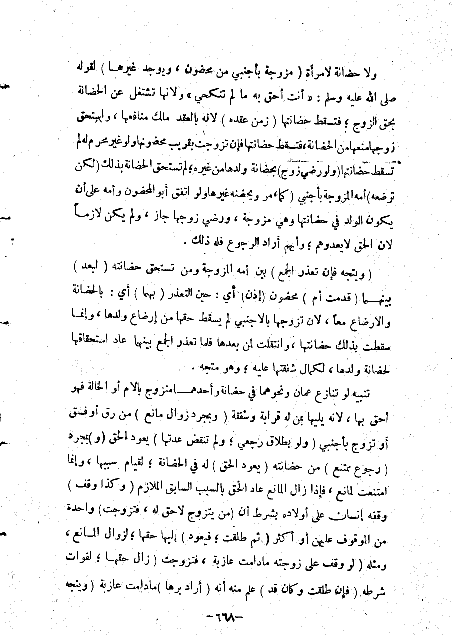 تَنْبِيهٌ: لَوْ تَنَازَعَ عَمَّيْنٍ وَنَحْوُهُمَا فِي حَضَانَةٍ وَأَحَدُهُمَا مُتَزَوِّجٌ بِالْأُمِّ أَوْ الْخَالَةِ فَهُوَ أَحَقُّ بِهَا؛ لِأَنَّهُ يَلِيهَا بِمَنْ لَهُ قَرَابَةٌ وَشَفَقَةٌ (بِمُجَرَّدِ زَوَالِ مَانِعٍ) مِنْ رِقٍّ أَوْ فِسْقٍ أَوْ تَزَوُّجٍ بِأَجْنَبِيٍّ (وَلَوْ بِطَلَاقٍ رَجْعِيٍّ؛ وَلَمْ تَنْقُضْ عِدَّتَهَا) يَعُودُ الْحَقُّ (وَ) بِمُجَرَّدِ (رُجُوعِ مُمْتَنِعٍ) مِنْ حَضَانَتِهِ (يَعُودُ الْحَقُّ) لَهُ فِي الْحَضَانَةِ؛ لِقِيَامِ سَبَبِهَا، وَإِنَّمَا امْتَنَعَتْ لِمَانِعٍ، فَإِذَا زَالَ الْمَانِعُ عَادَ الْحَقُّ بِالسَّبَبِ السَّابِقِ الْمُلَازِمِ.