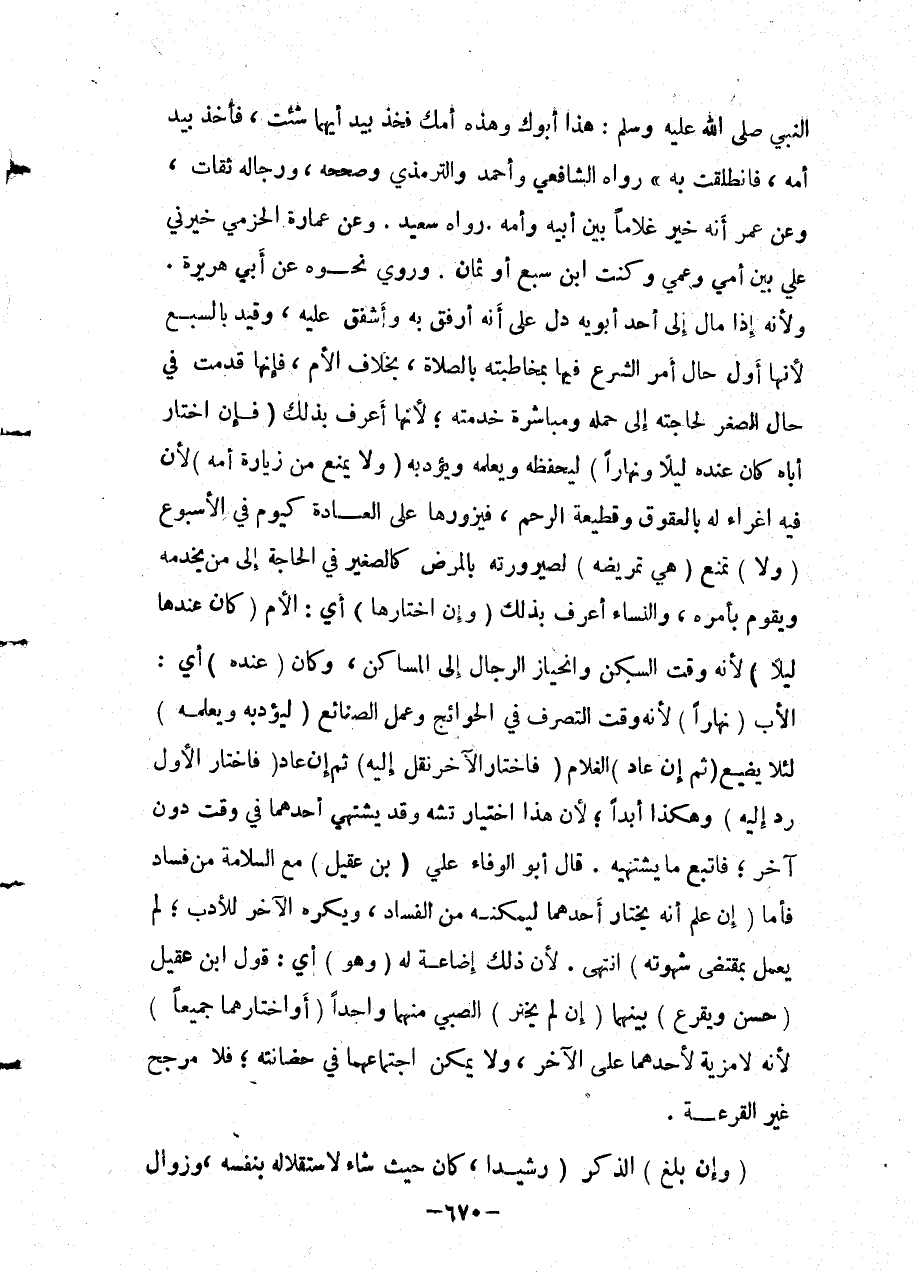 النَّبِيُّ - صَلَّى اللَّهُ عَلَيْهِ وَسَلَّمَ -: هَذَا أَبُوكَ وَهَذِهِ أُمُّكَ فَخُذْ بِيَدِ أَيِّهِمَا شِئْت، فَأَخَذَ بِيَدِ أُمِّهِ، فَانْطَلَقَتْ بِهِ» رَوَاهُ الشَّافِعِيُّ وَأَحْمَدُ وَالتِّرْمِذِيُّ وَصَحَّحَهُ، وَرِجَالُهُ ثِقَاتٌ، وَعَنْ عُمَرَ أَنَّهُ خَيَّرَ غُلَامًا بَيْنَ أَبِيهِ وَأُمِّهِ. رَوَاهُ سَعِيدٌ.