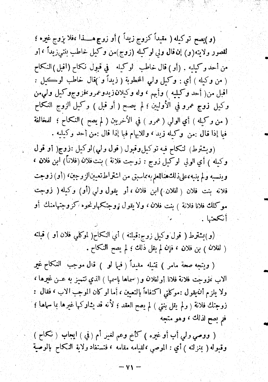 (وَ) يَصِحُّ تَوْكِيلُهُ (مُقَيَّدًا كَزَوِّجْ زَيْدًا) أَوْ زَوِّجْ هَذَا، فَلَا يُزَوِّجُ غَيْرَهُ؛ لِقُصُورِ وِلَايَتِهِ (وَ) إنْ قَالَ وَلِيٌّ لِوَكِيلِهِ (زَوِّجْ) مِنْ وَكِيلِ خَاطِبِ بِنْتِي زَيْدًا، أَوْ مِنْ أَحَدِ وَكِيلِيهِ. (أَوْ) قَالَ خَاطِبٌ لِوَكِيلِهِ فِي قَبُولِ نِكَاحٍ (اقْبَلْ) النِّكَاحَ (مِنْ وَكِيلِهِ) أَيْ: وَكِيلِ وَلِيِّ الْمَخْطُوبَةِ (زَيْدًا وَ) قَالَ خَاطِبٌ لِوَكِيلٍ: اقْبَلْ مِنْ (أَحَدِ وَكِيلَيْهِ) وَأَبْهَمَ، وَلَهُ وَكِيلَانِ زَيْدٌ وَعَمْرٌو، فَزَوَّجَ وَكِيلُ وَلِيٍّ مِنْ وَكِيلِ زَوْجٍ عَمْرٍو فِي الْأُولَيَيْنِ؛ لَمْ يَصِحَّ (أَوْ قَبِلَ) وَكِيلُ الزَّوْجِ النِّكَاحَ (مِنْ وَكِيلِهِ) أَيْ الْوَلِيِّ (عَمْرو) فِي الْأُخْرَيَيْنِ (لَمْ يَصِحَّ) النِّكَاحُ؛ لِلْمُخَالَفَةِ فِيمَا إذَا قَالَ: مِنْ وَكِيلِهِ زَيْدٍ، وَلِلْإِبْهَامِ فِيمَا إذَا قَالَ: مِنْ أَحَدِ وَكِيلِيهِ.