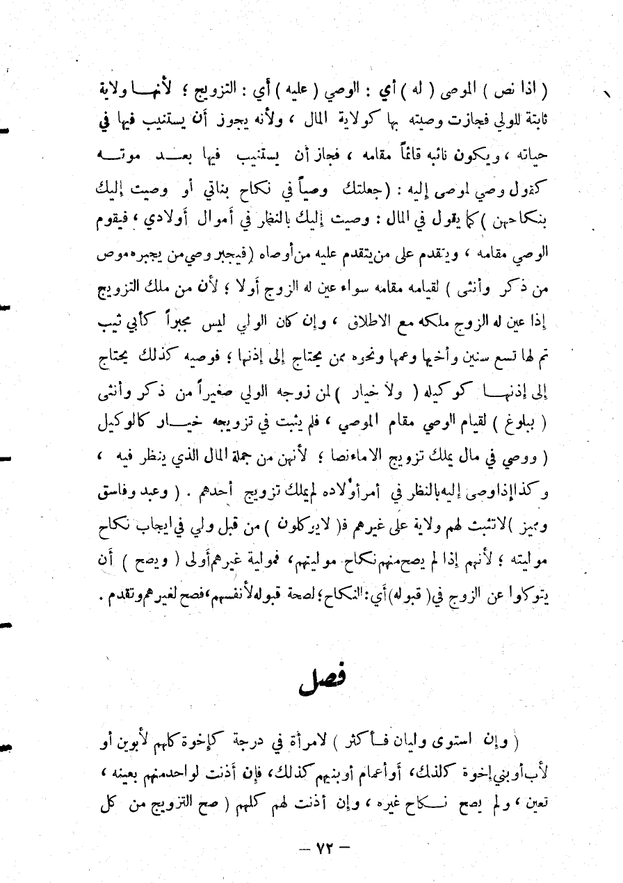 (إذَا نَصَّ) الْمُوصِي (لَهُ) أَيْ: الْوَصِيِّ (عَلَيْهِ) أَيْ: التَّزْوِيجِ؛ لِأَنَّهَا وِلَايَةٌ ثَابِتَةٌ لِلْوَلِيِّ فَجَازَتْ وَصِيَّتُهُ بِهَا كَوِلَايَةِ الْمَالِ، وَلِأَنَّهُ يَجُوزُ أَنْ يَسْتَنِيبَ فِيهَا فِي حَيَاتِهِ، وَيَكُونُ نَائِبُهُ قَائِمًا مَقَامَهُ، فَجَازَ أَنْ يَسْتَنِيبَ فِيهَا بَعْدَ مَوْتِهِ كَقَوْلِ وَصِيٍّ لِمُوصٍ إلَيْهِ: (جَعَلْتُك وَصِيًّا فِي نِكَاحِ بَنَاتِي أَوْ وَصَّيْت إلَيْك بِنِكَاحِهِنَّ) كَمَا يَقُولُ فِي الْمَالِ: وَصَّيْت إلَيْك بِالنَّظَرِ فِي أَمْوَالِ أَوْلَادِي، فَيَقُومُ الْوَصِيُّ مَقَامَهُ، وَيَتَقَدَّمُ عَلَى مَنْ يَتَقَدَّمُ عَلَيْهِ مَنْ أَوْصَاهُ (فَيُجْبِرُ وَصِيٌّ مَنْ يُجْبِرُهُ مُوصٍ مِنْ ذَكَرٍ وَأُنْثَى) لِقِيَامِهِ مَقَامَهُ سَوَاءٌ عَيَّنَ لَهُ الزَّوْجَ أَوْ لَا؛ لِأَنَّ مَنْ مَلَكَ التَّزْوِيجَ إذَا عَيَّنَ لَهُ الزَّوْجُ مِلْكَهُ مَعَ الْإِطْلَاقِ، وَإِنْ كَانَ الْوَلِيُّ لَيْسَ مُجْبِرًا كَأَبِي ثَيِّبٍ تَمَّ لَهَا تِسْعُ سِنِينَ وَأَخِيهَا وَعَمِّهَا وَنَحْوِهِ مِمَّنْ يَحْتَاجُ إلَى إذْنِهَا؛ فَوَصِيُّهُ كَذَلِكَ يَحْتَاجُ إلَى إذْنِهَا كَوَكِيلِهِ (وَلَا خِيَارَ) لِمَنْ زَوَّجَهُ الْوَلِيُّ صَغِيرًا مِنْ ذَكَرٍ وَأُنْثَى (بِبُلُوغٍ) لِقِيَامِ الْوَصِيِّ مَقَامَ الْمُوصِي، فَلَمْ: يَثْبُتْ فِي تَزْوِيجِهِ خِيَارٌ كَالْوَكِيلِ (وَوَصِيٌّ فِي مَالٍ يَمْلِكُ تَزْوِيجَ الْإِمَاءِ نَصًّا) ؛ لِأَنَّهُنَّ مِنْ جُمْلَةِ الْمَالِ الَّذِي يَنْظُرُ فِيهِ، وَكَذَا إذَا وَصَّى إلَيْهِ بِالنَّظَرِ فِي أَمْرِ أَوْلَادِهِ لَمْ يَمْلِكْ تَزْوِيجَ أَحَدِهِمْ.