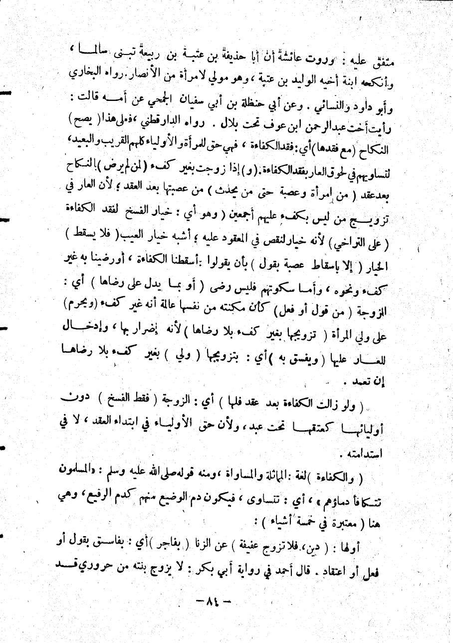 مُتَّفَقٌ عَلَيْهِ: وَرَوَتْ عَائِشَةُ أَنَّ أَبَا حُذَيْفَةَ بْنَ عُتْبَةَ بْنَ رَبِيعَةَ تَبَنَّى سَالِمًا، وَأَنْكَحَهُ ابْنَةَ أَخِيهِ الْوَلِيدِ بْنِ عُتْبَةَ، وَهُوَ مَوْلًى لِامْرَأَةٍ مِنْ الْأَنْصَارِ. رَوَاهُ الْبُخَارِيُّ وَأَبُو دَاوُد وَالنَّسَائِيُّ. وَعَنْ أَبِي حَنْظَلَةَ بْنِ أَبِي سُفْيَانَ الْجُمَحِيُّ عَنْ أُمِّهِ قَالَتْ: رَأَيْت أُخْتَ عَبْدِ الرَّحْمَنِ بْنِ عَوْفٍ تَحْتَ بِلَالٍ. رَوَاهُ الدَّارَقُطْنِيّ، فَعَلَى هَذَا (يَصِحُّ) النِّكَاحُ (مَعَ فَقْدِهَا) أَيْ: فَقْدِ الْكَفَاءَةِ، فَهِيَ حَقٌّ لِلْمَرْأَةِ وَالْأَوْلِيَاءِ كُلِّهِمْ الْقَرِيبِ وَالْبَعِيدِ، لِتَسَاوِيهِمْ فِي لُحُوقِ الْعَارِ بِفَقْدِ الْكَفَاءَةِ. (وَ) إذَا زُوِّجَتْ بِغَيْرِ كُفْءٍ (لِمَنْ لَمْ يَرْضَ) بِالنِّكَاحِ بَعْدَ عَقْدٍ (مِنْ امْرَأَةٍ وَعَصَبَةٍ حَتَّى مَنْ يَحْدُثُ) مِنْ عَصَبَتِهَا بَعْدَ الْعَقْدِ؛ لِأَنَّ الْعَارَ فِي تَزْوِيجِ مَنْ لَيْسَ بِكُفْءٍ عَلَيْهِمْ أَجْمَعِينَ (وَهُوَ) أَيْ: خِيَارُ الْفَسْخِ لِفَقْدِ الْكَفَاءَةِ، (عَلَى التَّرَاخِي) لِأَنَّهُ خِيَارٌ لِنَقْصٍ فِي الْمَعْقُودِ عَلَيْهِ؛ أَشْبَهَ خِيَارَ الْعَيْبِ (فَلَا يَسْقُطُ) الْخِيَارُ (إلَّا بِإِسْقَاطِ عَصَبَةٍ بِقَوْلٍ) بِأَنْ يَقُولُوا: أَسْقَطْنَا الْكَفَاءَةَ، أَوْ رَضِينَا بِهِ غَيْرَ كُفْءٍ وَنَحْوِهِ، وَأَمَّا سُكُوتُهُمْ فَلَيْسَ رِضًى (أَوْ بِمَا يَدُلُّ عَلَى رِضَاهَا) أَيْ: الْمُزَوَّجَةِ (مِنْ قَوْلٍ أَوْ فِعْلٍ) كَأَنْ مَكَّنَتْهُ مِنْ نَفْسِهَا عَالِمَةً أَنَّهُ غَيْرُ كُفْءٍ.