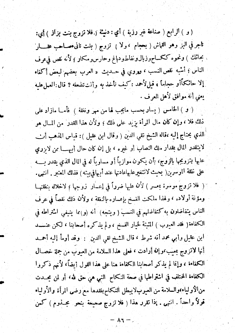 (وَ) الْخَامِسُ (يَسَارٌ بِحَسَبِ مَا يَجِبُ لَهَا مِنْ مَهْرٍ وَنَفَقَةٍ) فَأَمَّا مَا زَادَ عَلَى ذَلِكَ فَلَا، وَإِنْ كَانَ مَالُ الْمَرْأَةِ يَزِيدُ عَلَى ذَلِكَ؛ وَلِأَنَّ هَذَا الْقَدْرَ مِنْ الْمَالِ هُوَ الَّذِي يُحْتَاجُ إلَيْهِ، قَالَهُ الشَّيْخُ تَقِيُّ الدِّينِ (وَقَالَ ابْنُ عَقِيلٍ) : قِيَاسُ الْمَذْهَبِ أَنْ لَا يَتَقَدَّرَ الْمَالُ بِمِقْدَارِ مِلْكِ النِّصَابِ أَوْ غَيْرِهِ، بَلْ إنْ كَانَ حَالُ أَبِيهَا مِمَّنْ لَا يُزْرِي عَلَيْهَا بِتَزْوِيجِهَا بِالزَّوْجِ، بِأَنْ يَكُونَ مُوَازِيًا أَوْ مُسَاوِيًا لَهُ فِي الْمَالِ الَّذِي يَقْدِرُ بِهِ عَلَى نَفَقَةِ الْمُوسِرِينَ (بِحَيْثُ لَا تَتَغَيَّرُ عَلَيْهَا عَادَتُهَا عِنْدَ أَبِيهَا فِي بَيْتِهِ) فَذَلِكَ الْمُعْتَبَرُ. انْتَهَى.
