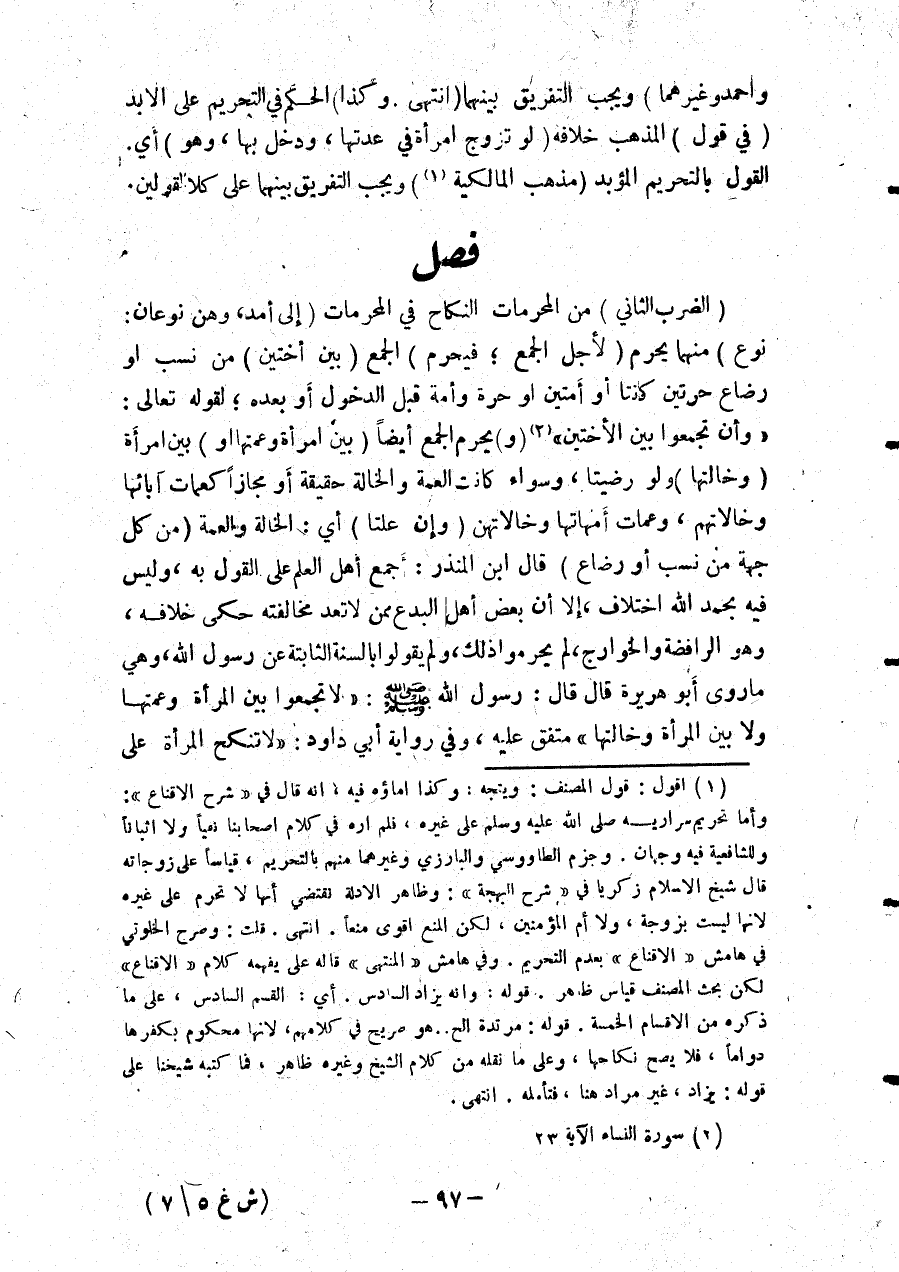 فَصْلٌ (الضَّرْبُ الثَّانِي) مِنْ الْمُحَرَّمَاتِ النِّكَاحُ فِي الْمُحَرَّمَاتِ (إلَى أَمَدٍ، وَهُنَّ نَوْعَانِ نَوْعٌ) مِنْهُمَا يُحَرَّمُ (لِأَجْلِ الْجَمْعِ؛ فَيُحَرَّمُ) الْجَمْعُ (بَيْنَ أُخْتَيْنِ) مِنْ نَسَبٍ أَوْ رَضَاعٍ حُرَّتَيْنِ كَانَتَا أَوْ أَمَتَيْنِ أَوْ حُرَّةً وَأَمَةً قَبْلَ الدُّخُولِ أَوْ بَعْدَهُ؛ لِقَوْلِهِ تَعَالَى {وَأَنْ تَجْمَعُوا بَيْنَ الأُخْتَيْنِ} [النساء: 23] (وَ) يَحْرُمُ الْجَمْعُ أَيْضًا (بَيْنَ امْرَأَةٍ وَعَمَّتِهَا أَوْ) بَيْنَ امْرَأَةٍ (وَخَالَتِهَا) وَلَوْ رَضِيَتَا، وَسَوَاءٌ كَانَتْ الْعَمَّةُ وَالْخَالَةُ حَقِيقَةً أَوْ مَجَازًا كَعَمَّاتِ آبَائِهَا وَخَالَاتِهِمْ، وَعَمَّاتِ أُمَّهَاتِهَا وَخَالَاتِهِنَّ (وَإِنْ عَلَتَا) أَيْ: الْخَالَةُ وَالْعَمَّةُ (مِنْ كُلِّ جِهَةٍ مِنْ نَسَبٍ أَوْ رَضَاعٍ) قَالَ ابْنُ الْمُنْذِرِ: أَجْمَعَ أَهْلُ الْعِلْمِ عَلَى الْقَوْلِ بِهِ، وَلَيْسَ فِيهِ - بِحَمْدِ اللَّهِ - اخْتِلَافٌ، إلَّا أَنَّ بَعْضَ أَهْلِ الْبِدَعِ مِمَّنْ لَا تُعَدُّ مُخَالَفَتُهُ حَكَى خِلَافَهُ، وَهُوَ الرَّافِضَةُ وَالْخَوَارِجُ، لَمْ يُحَرِّمُوا ذَلِكَ، وَلَمْ يَقُولُوا بِالسُّنَّةِ الثَّابِتَةِ عَنْ رَسُولِ اللَّهِ، وَهِيَ مَا رَوَى أَبُو هُرَيْرَةَ، قَالَ: قَالَ: رَسُولُ اللَّهِ - صَلَّى اللَّهُ عَلَيْهِ وَسَلَّمَ - «لَا تَجْمَعُوا بَيْنَ الْمَرْأَةِ وَعَمَّتِهَا وَلَا بَيْنَ الْمَرْأَةِ وَخَالَتِهَا» مُتَّفَقٌ عَلَيْهِ، وَفِي رِوَايَةِ أَبِي دَاوُد: «لَا تُنْكَحُ الْمَرْأَةُ عَلَى