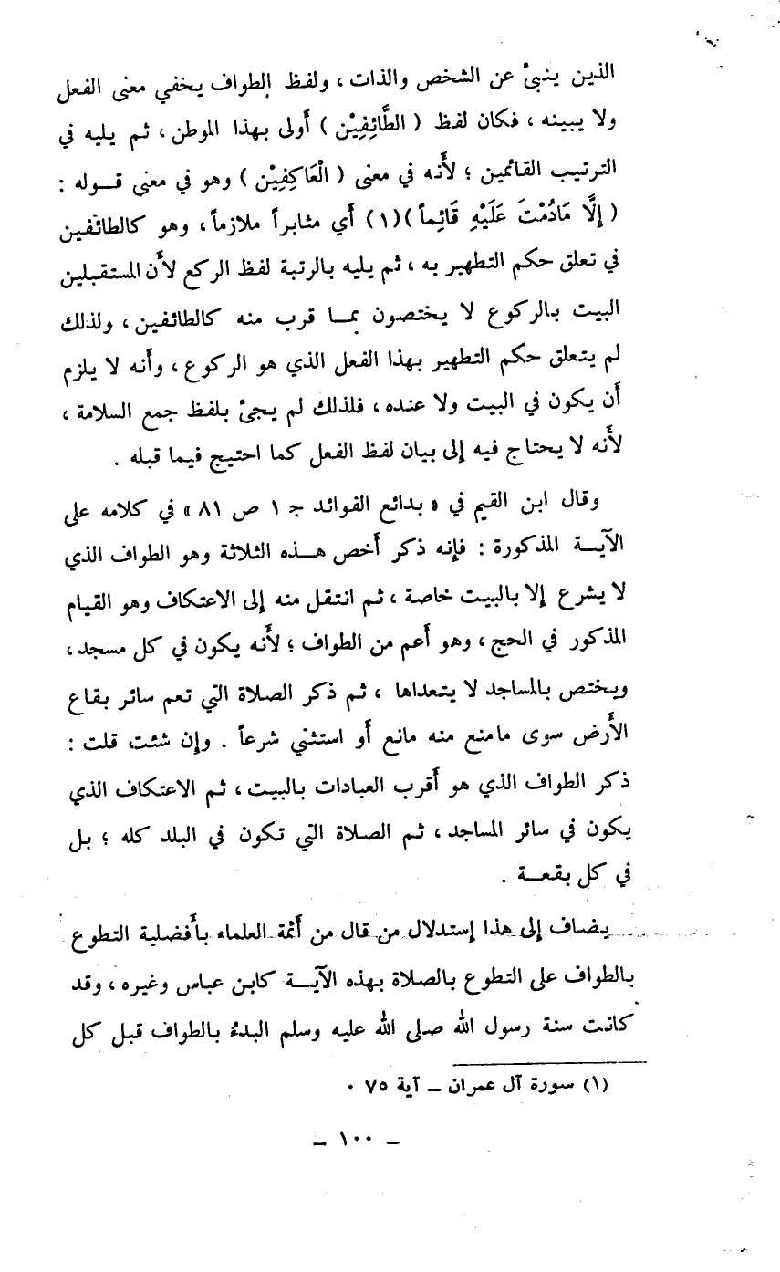 وقال ابن القيم في "بدائع الفوائد ج1 ص81" في كلامه على الآية المذكورة: فإنه ذكر أخص هذه الثلاثة وهو الطواف الذي لا يشرع إلا بالبيت خاصة، ثم انتقل منه إلى الاعتكاف وهو القيام المذكور في الحج، وهو أعم من الطواف، لأنه يكون في كل مسجد، ويختص بالمساجد لا يتعداها، ثم ذكر الصلاة التي تعم سائر بقاع الأرض سوى ما منع منه مانع أو استثنى شرعًا. وإن شئت قلت: ذكر الطواف الذي هو أقرب من العبادات بالبيت: ثم الاعتكاف الذي يكون في سائر المساجد، ثم الصلاة التي تكون في البلد كله، بل في كل بقعة.