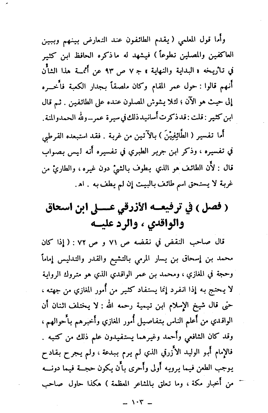 قال صاحب النقض في نقضه ص71 وص72: (إذا كان محمد بن إسحاق بن يسار المرمي بالتشيع والقدر والتدليس إمامًا وحجة في المغازي، ومحمد بن عمر الواقدي الذي هو متروك الرواية لا يحتج به إذا انفرد إنما يستفاد كثير من أمور المغازي من جهته، حتى قال شيخ الاسلام ابن تيمية رحمه الله: لا يختلف اثنان أن الواقدي من أعلم الناس بتفاصيل أمور المغازي وأخبرهم بأحوالهم. وقد كان الشافعي وأحمد وغيرهما يستفيدون علم ذلك من كتبه. فالإمام أبوالوليد الأزرقي الذي لم يرم ببدعة، ولم يجرح بقادح يوجب الطعن يما يرويه أولى وأحرى بأن يكون حجة فيما دونه من أخبار مكة، وما تعلق بالمشاعر المعظمة) هكذا حاول صاحب