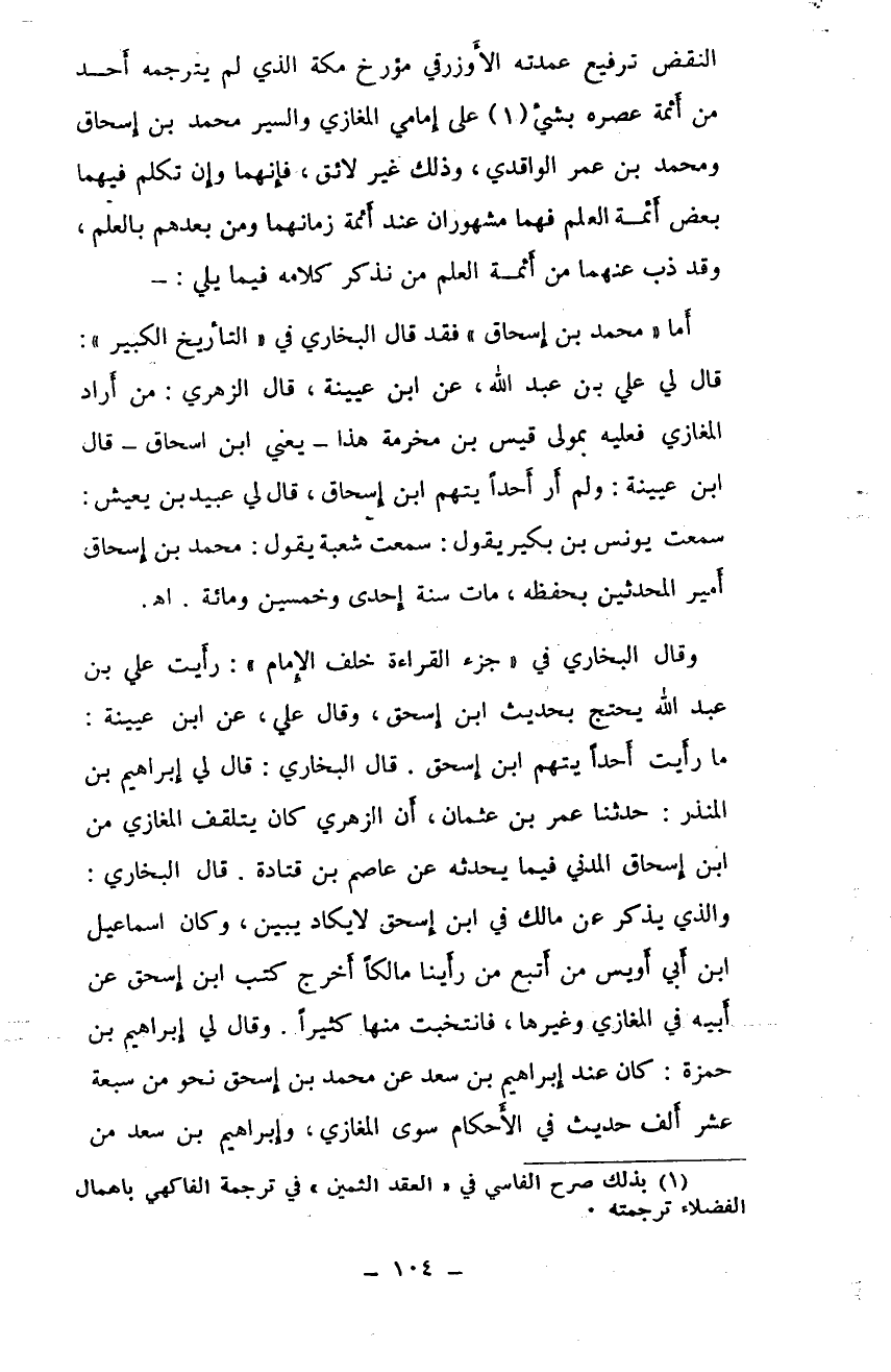 النقض ترفيع عمدته الأوزرقي مؤرخ مكة الذي لم يترجمه أحد من أئمة عصره بشيء (¬1) على إمامي المغازي والسير محمد بن إسحاق ومحمد بن عمر الواقدي، وذلك غير لائق، فإنهما وإن تكلم فيهما بعض أئمة العلم فهما مشهوران عند أئمة زمانهما ومن بعدهم بالعلم، وقد ذب عنهما من أئمة العلم من تذكر كلامه فيما يلي:
