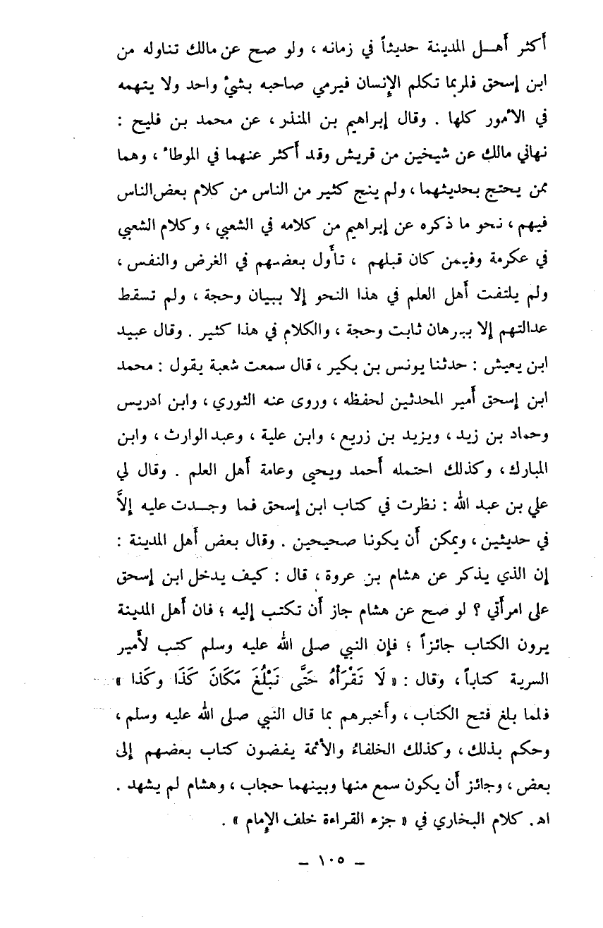 أكثر أهل المدينة حديثًا في زمانه، ولو صح عن مالك تناوله من ابن إسحق فلربما تكلم الإنسان فيرمي صاحبه بشيء واحد ولا يتهمه في الأمور كلها. وقال إبراهيم بن المنذر، عن محمد بن فليح: نهاني مالك عن شيخين من قريش وقد أكثر عنهما في الموطأ، وهما ممن يحتج بحديثهما، ولم ينج كثير من الناس من كلام بعض الناس فيهم، نحو ما ذكره عن إبراهيم من كلامه في الشعبي، وكلام الشعبي في عكرمة وفيمن كان قبلهم، تأول بعضهم في الغرض والنفس. ولم يلتفت أهل العلم في هذا النحو إلا ببيان وحجة، ولم تسقط عدالتهم إلا ببرهان ثابت وحجة، والكلام في هذا كثير. وقال عبيد ابن يعيش: حدثنا يونس بن بكير. قال سمعت شعبة يقول: محمد ابن اسحاق أمير المحدثين لحفظه. وروى عنه الثورين وابن ادريس وحماد بن زيد، ويزيد بن زريع. وابن علية. وعبد الوارق، وابن المبارك، وكذلك احتمله أحمد ويحيى وعامة أهل العلم. وقال لي علي بن عبد الله: نظرت في كتاب ابن إسحق فما وجدت عليه إلا في حديثين، ويمكن أن يكونا صحيحين. وقال بعض أهل المدينة: إن الذي يذكر عن هشام بن عروة.