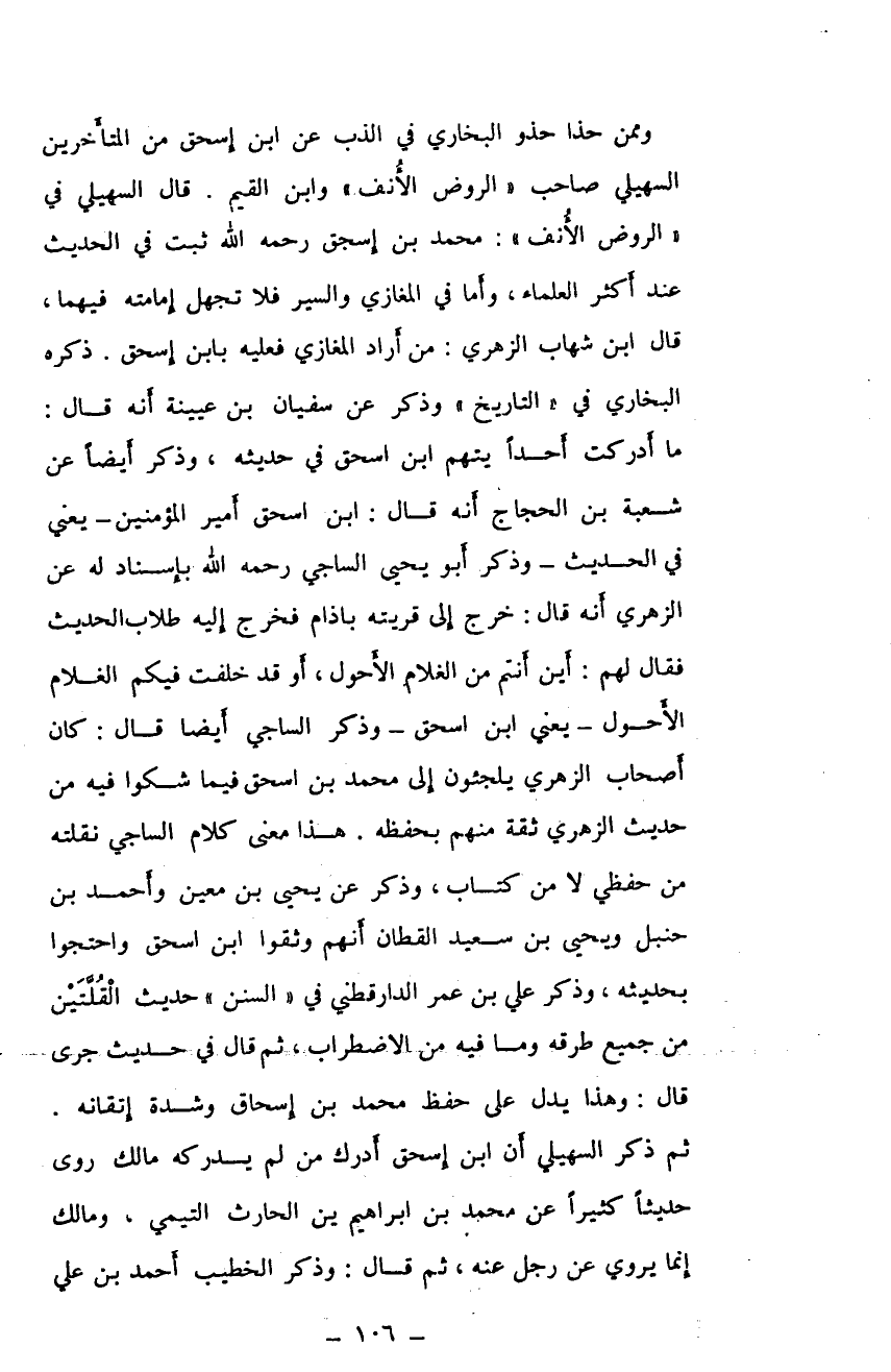 وممن حذا حذو البخاري في الذب عن ابن إسحق من المتأخرين السهيلي صاحب "الروض الأنف" وابن القيم. قال السهيلي في "الروض الأنف": محمد بن إسحق رحمه الهل ثبت في الحديث عند أكثر العلماء، وأما في المغازي والسير فلا تجهل إمامته فيهما، قال ابن شهاب الزهري: من أراد المغازي فعليه بابن إسحق. ذكره البخاري في "التاريخ" وذكر عن سفيان بن عيينة أنه قال: ما أدركت أحدًا يتهم ابن إسحق في حديثه، وذكر أيضًا عن شعبة بن الحجاج أنه قال: ابن إسحق أمير المؤمنين - يعني في الحديث - وذكر أبويحيى الساجي رحمه الله بإسناد له عن الزهري أنه قال: خرج إلى قريته باذام فخرج غليه طلاب الحديث فقال لهم: أين أنتم من الغلام الأحول، أو قد خلفت فيكم الغلام الأحول - يعني ابن اسحق - وذكر الساجي أيضا قال: كان أصحاب الزهري يلجئون إلى محمد بن اسحق فيما شكوا فيه من حديث الزهري ثقة منهم بحفظه. هذا معنى كلام الساجي نقلته من حفظي لا من كتاب. وذكر عن يحيى بن معين وأحمد بن حنبل ويحيى بن سعيد القطان أنهم وثقوا ابن اسحق واحتجوا بحديثه. وذكر علي بن عمر الدارقطني في "السنن" حديث القلتين من جمؤع طرقه وما فيه من الاضطراب. ثم قال في حديث جرى قال: وهذا يدل على حفظ محمد بن إسحاق وشدة إتقانه.