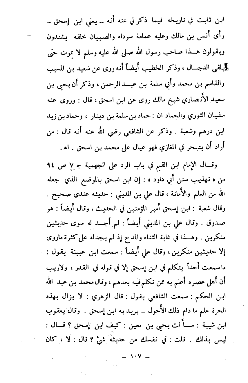 وقال الإمام ابن القيم في باب الرد على الجهمية ج7 ص94 من "تهذيب سنن أبي داود": إن ابن اسحق بالموضع الذي جعله الله من العلم والأمانة. قال علي بن المديني: حديثه عندي صحيح. وقال شعبة: ابن إسحق أمير المؤمنين في الحديث. وقال أيضًا: هو هو صدوق. وقال علي بن المديني أيضًأ: لم أجد له سوى حديثين متكريين. وهذا في غاية الثناء والمدح إذ لم يجد له على كثرة ما روى إلا حديثين متكريين، وقال علي أيضًا: سمعت ابن عيينة يقول: ما سمعت أحدًا يتكلم في ابن إسحق إلا في قوله في القدر، ولا ريب أن أهل عصره أعلم به ممن تكلم فيه بعدهم. وقال محمد بن عبد الله ابن الحكم: سمعت الشافعي يقول: قال الزهري: لا يزال بهذه الحرة علم مادام ذلك الأحول - يريد به ابن إسحق - وقال يعقوب ابن شيبة: سألت يحيى بن معين: كيف ابن إسحق؟ قال: ليس بذلك. قلت: في نفسك من حديثه شيء؟ قال: لا، كان