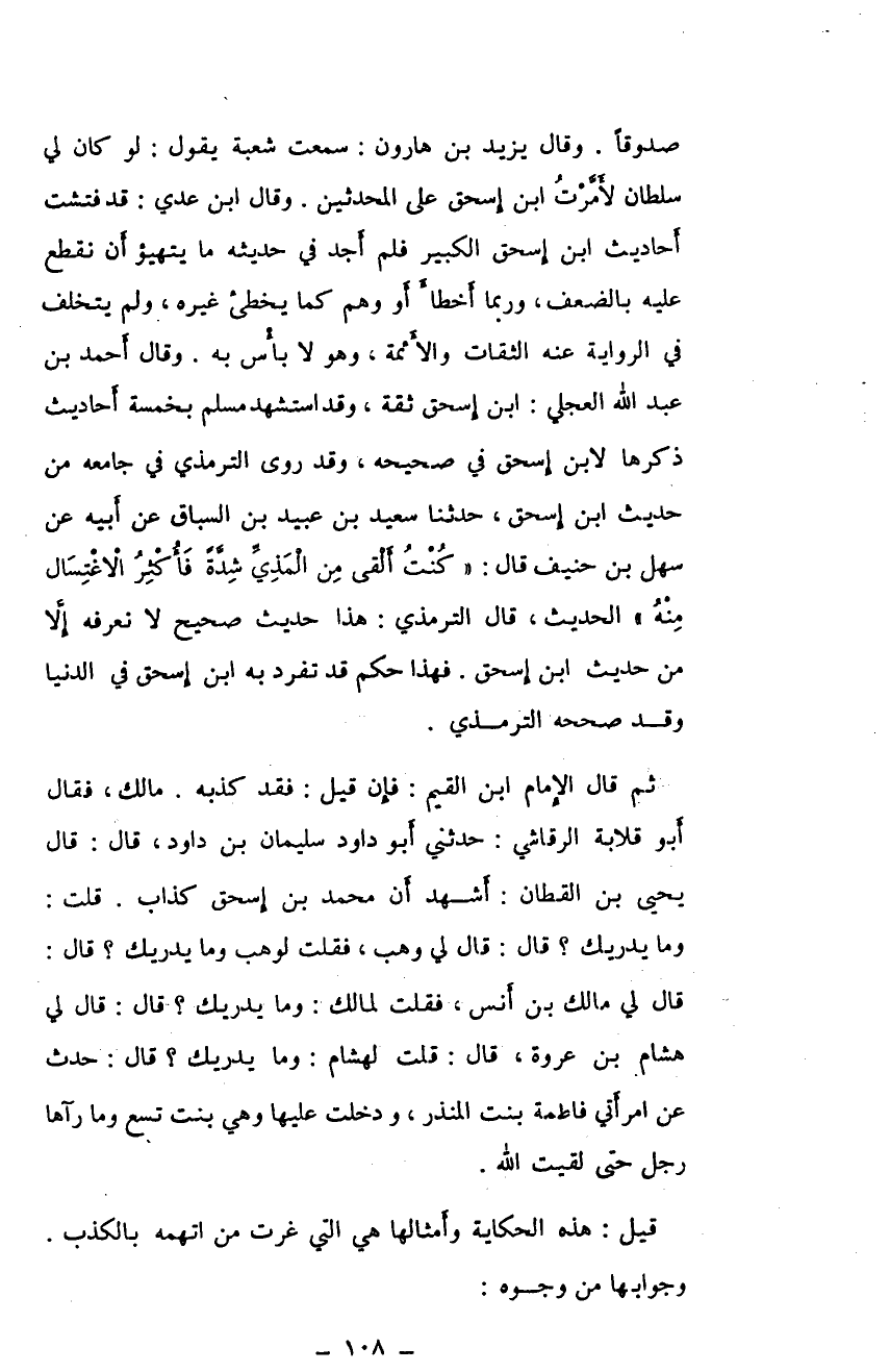 صدوقًا. وقال يزيد بن هارون: سمعت شعبة يقول: لو كان في سلطان لأمرت ابن إسحق على المحدثين. وقال ابن عدي: قد فتشت أحاديث ابن إسحق الكبير فلم أجد في حديثه ما يتهيؤ أن نقطع عليه بالضعف. وربما أخطأ أو وهم كما يخطيء غيره، ولم يتخلف في الرواية عنه الثقات والأئمة. وهو لا بأس به. وقال أحمد بن عبد الله العجلي: ابن اسحق ثقة. وقد استشهد مسلم بخمسة أحاديث ذكرها لابن إسحق في صحيحه. وقد روى الترمذي في جامعه من حديث ابن إسحق، حدثنا سعيد بن عبيد بن السباق عن أبيه عن سهل بن حنيف قال: "كنت ألقى من المذي شدة فأكثر الاغتسال منه" الحديث. قال الترمذي: هذا حديث صحيح لا تعرفه إلا من حديث ابن اسحق. فهذا حكم قد تفرد به ابن إسحق في الدنيا وقد صححه الترمذي.