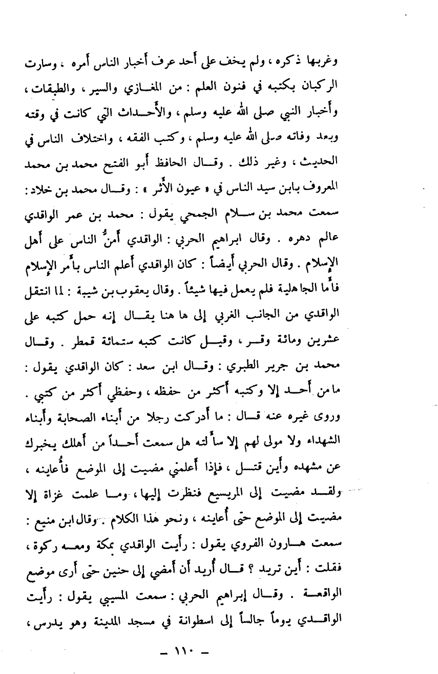 وغربها ذكره، ولم يخف على أحد عرف أخبار الناس أمره، وسارت الركبان بكتبه في فنون العلم: من المغازي والسير، والطبقات، وأخبار النبي صلى الله عليه وسلم، والأحداث التي كانت في وقته وبعد وفاته صلى الله عليه وسلم. وكتب الفقه، واختلاف الناس في الحديث. وغير ذلك. وقال الحافظ أبوالفتح محمد بن محمد المعروف بابن سيد الناس في "عيون الأثر": وقال محمد بن خلاد: سمعت محمد بن سلام الجمحي يقولك محمد بن عمر الواقدي عالم دهره. وقال إبراهيم الحربي: الواقدي أمن الناس على أهل الإسلام. وقال الحربي أيضًا: كان الواقدي أعلم الناس بأمر الإسلام فأما الجاهلية فلم يعمل فيها شيئًا. وقال يعوب بن شيبة: لما انتقل الواقدي من الجانب الغربي إلى ها هنا يقال إنه حمل كتبه على عشرين ومائة وقر. وقيل كانت كتبه ستمائة قمطر، وقال محمد بن جرير الطبري: وقال ابن سعد: كان الواقدي يقول: ما من أحد إلا وكتبه أكثر من حفظه، وحفظي أكثر من كتبي، وروى غيره عنه قال: ما أدركت رجلا من أبناء الصحابة وأبناء الشهداء ولا مولى لهم إلا سألته هل سمعت أحدًا من أهلك يخبرك عن مشهده وأين قتل، فإذا أعلمني مضيت إلى الموضع فأعاينه، ولقد مضيت إلى المريسيع فنظرت إليها، وما علمت غزاة إلا مضيت إلى الموضع حتى أعاينه، ونحو هذا الكلام. وقال ابن منيع: سمعت هارون الفروي يقول: رأيت الواقدي بمكة ومعه ركوة، فقلت: أين تريد؟ قال أريد أن أمضي إلى حنين حتى أرى موضع الواقعة.