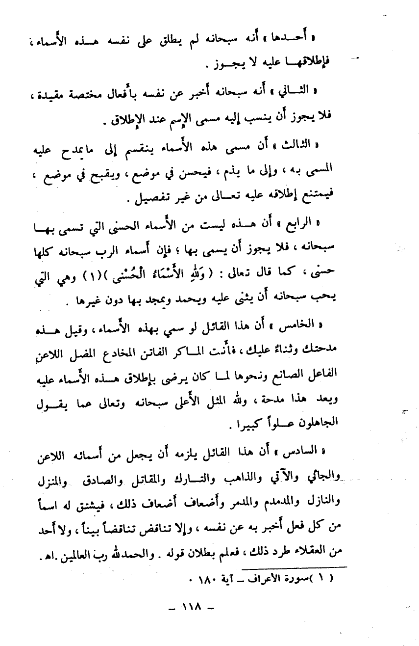 "السادس" أن هذا القائل يلزمه أن يجعل من أسمائه اللاعن والجائي والآلي والذاهب والتارك والمقاتل والصادق والمنزل والنازل والمدموم والمدمر وأضعاف أضعاف ذلك، فيشتق له اسمًا من كل فعل أخبر به عن نفسه، وإلا تناقض تناقضًا بينًا، ولا أحد من العقلاء طرد ذلك، فعلم بطلان قوله. والحمد لله رب العالمين. أهـ.
