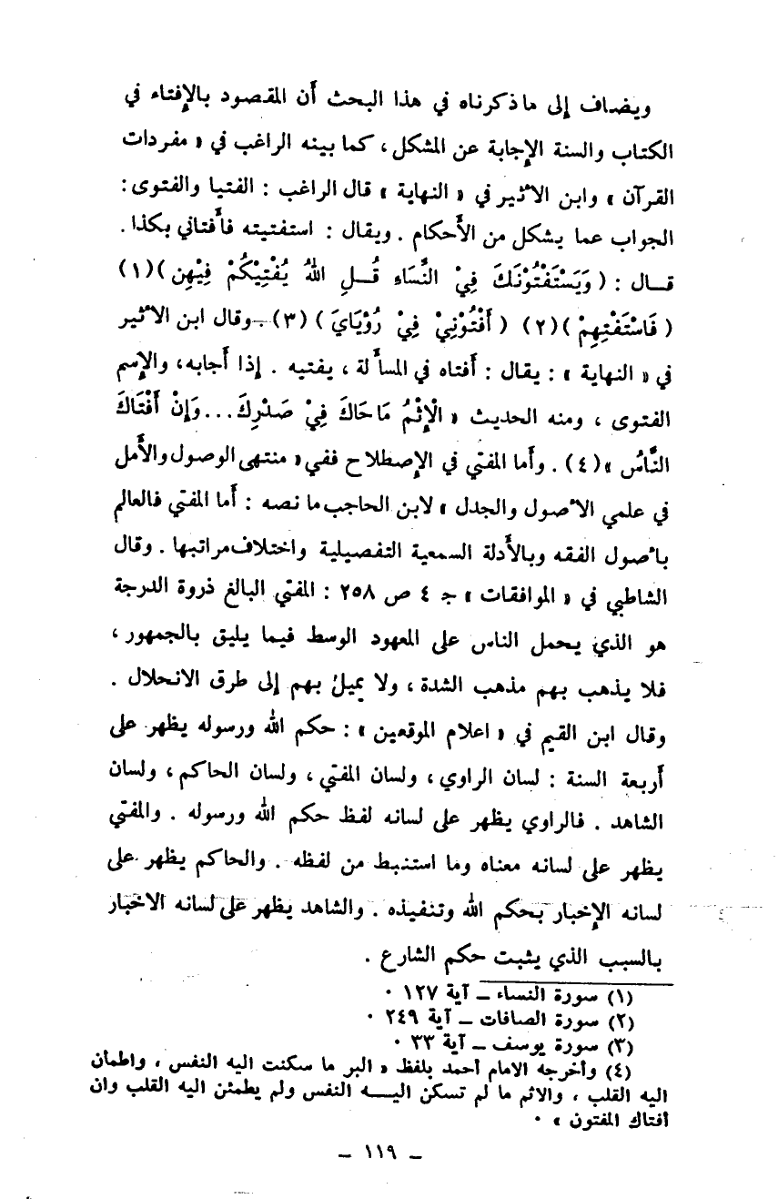 ويضاف إلى ما ذكرناه في هذا البحث أن المقصود بالإفتاء في الكتاب والسنة الإجابة عن المشكل، كما بينه الراغب في "مفردات القرآن" وابن الأثير في "النهاية" قال الراغب: الفتيا والفتوى: الجواب عما يشكل من الأحكام. ويقال: استفتيته فأفتاني بكذا، قال: (ويستفتونك في النساء قل الله يفتيكم فيهن) (¬1) (فاستفتهم) (¬2) (أفتوني في رؤياي) (¬3) . وقال ابن الأثير في "النهاية": يقال: أفتاه في المسألة، يفتيه. إذا أجابه، والإسم الفتوى. ومنه الحديث "الإثم ما حاك في صدرك ... وإن أفتاك الناس" (¬4) . وأما المفتي في الإصطلاح ففي "منتهى الوصول والأمل في علمي الأصول والجدل" لابن الحاجب ما نصه: أما المفتي فالعالم بأصول الفقه وبالأدلة السمعية التفصيلية واختلاف مراتبها. وقال الشاطبي في "الموافقات" ج4 ص258: المفتي البالغ ذروة الدرجة هو الذي يحمل الناس على المعهود الوسط فيما يليق بالجمهور، فلا يذهب بهم مذهب الشدة، ولا يميل بهم إلى طرق الانحلال. وقال ابن القيم في "اعلام الموقعين": حكم الله ورسوله يظهر على أربعة السنة: لسان الراوي، ولسان المفتي، ولسان الحاكم، ولسان الشاهد. فالراوي يظهر على لسانه لفظ حكم الله ورسوله. والمفتي يظهر على لسانه معناه وما استنبط من لفظه. والحاكم يظهر على لسانه الإخبار بحكم الله وتنفيذه. والشاهد يظهر على لسانه الأخبار بالسبب الذي يثبت حكم الشارع.